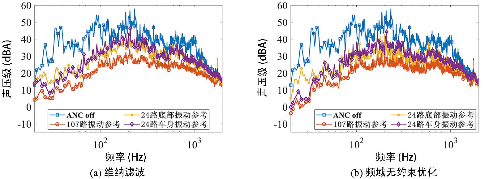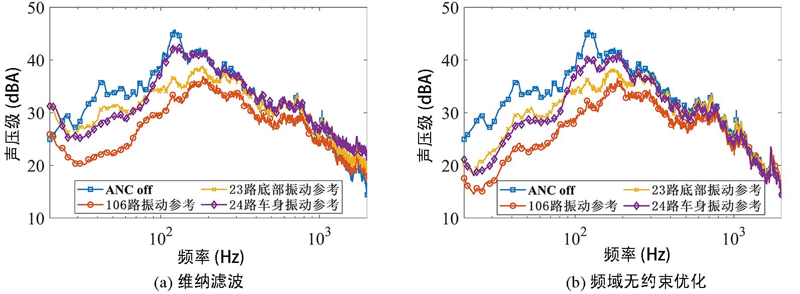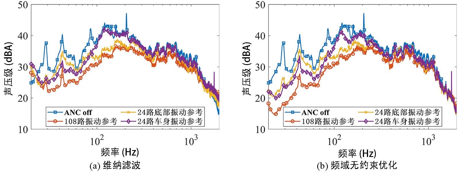 转鼓实验底部振动参考(包含底盘和车内地面)及不同数目车身振动参考的降噪量 (dBA)
