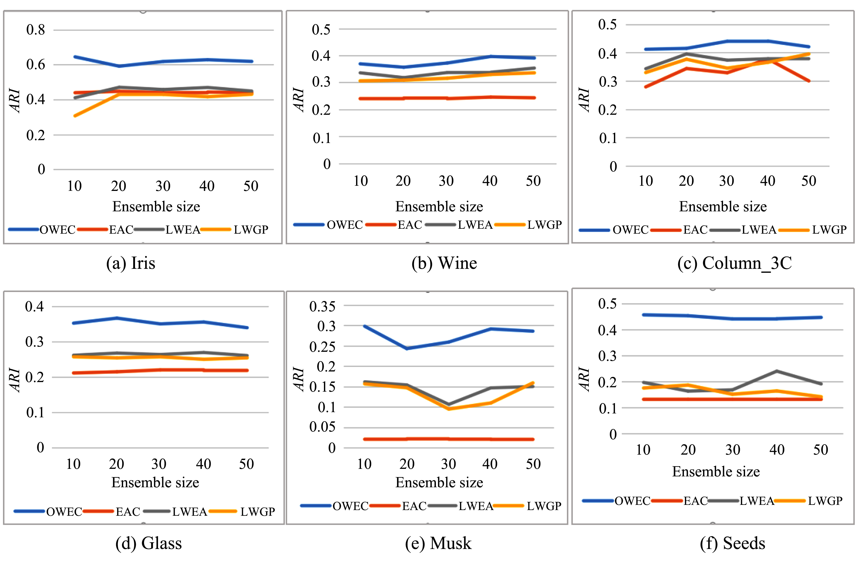| 图3 在不同集成规模下不同的算法在各个数据集上的平均性能(ARI) |