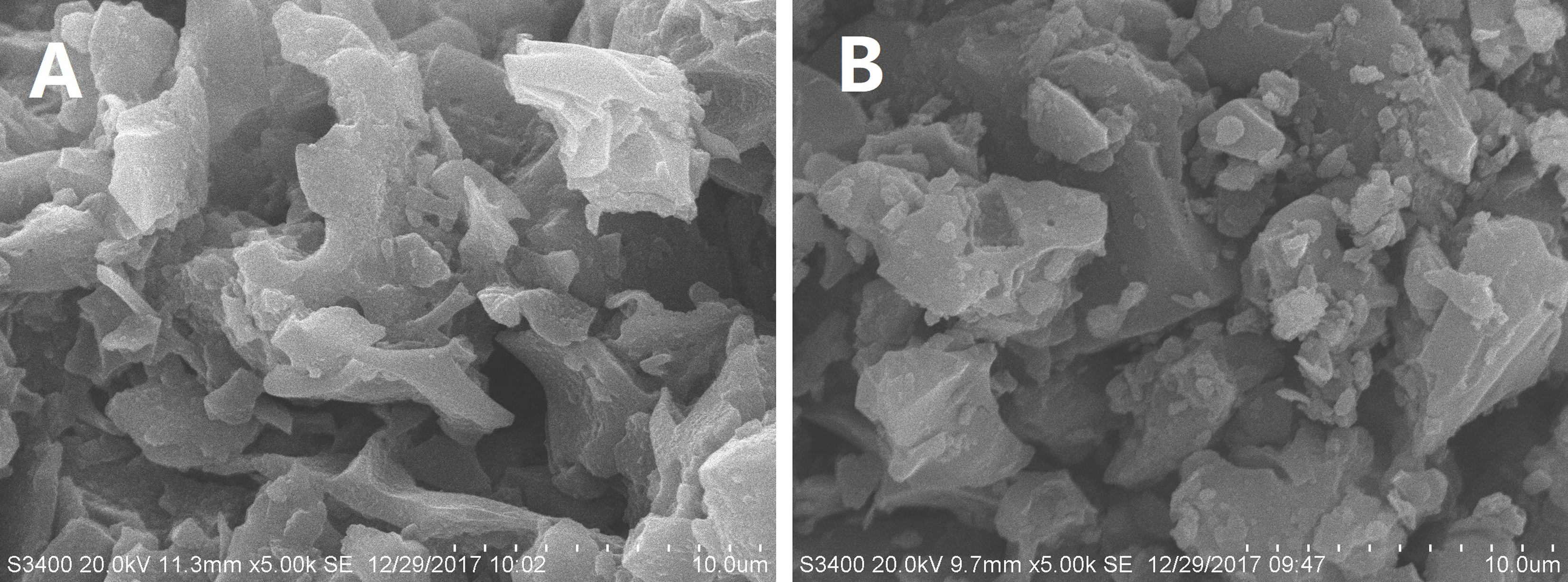 | Fig. 4 SEM images of semicoke (A) and semicoke blended by coal (B) |