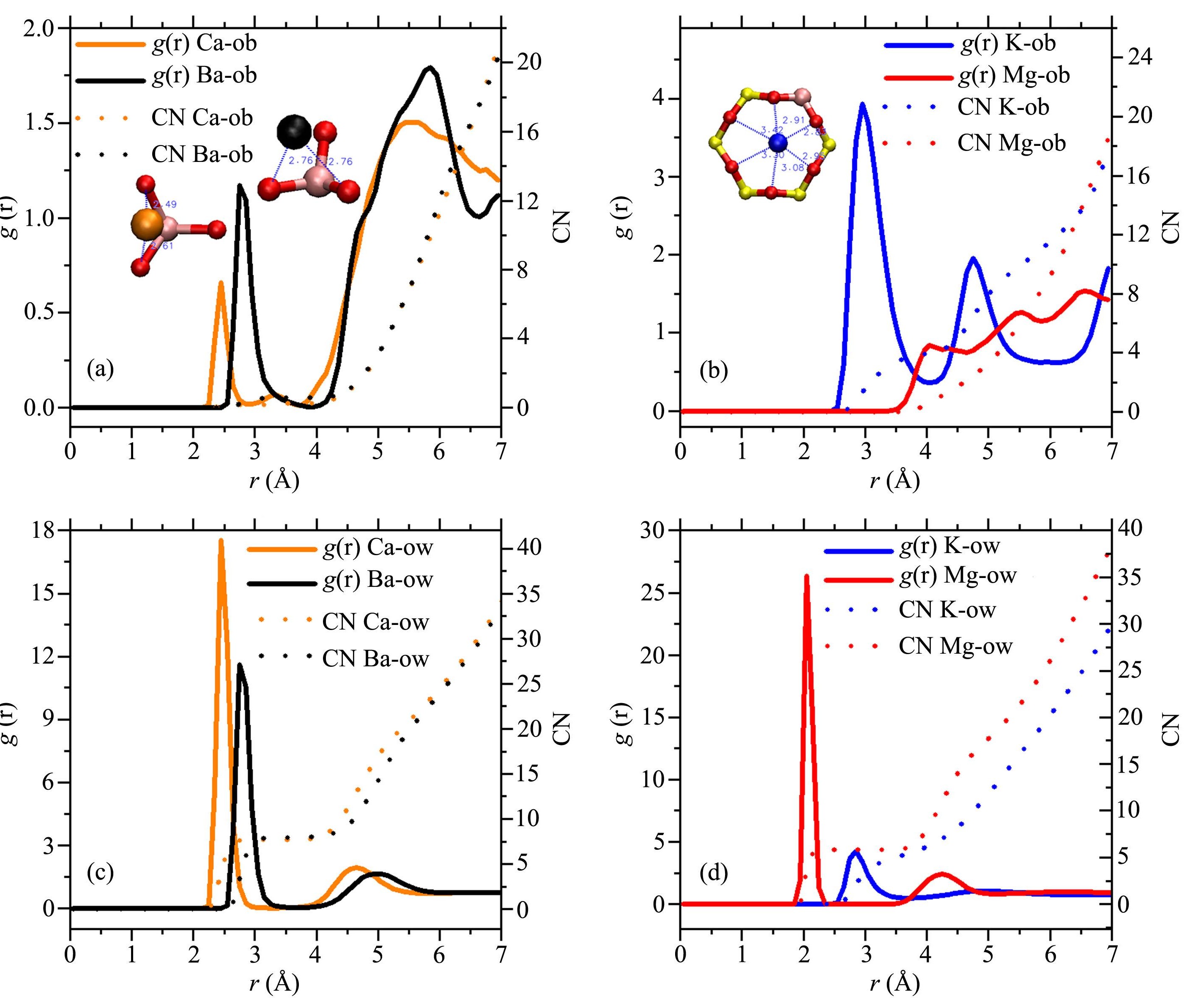 | 图4 阳离子与蒙脱石表面氧原子(ob)和水分子中氧原子(ow)的径向分布与配位数 |