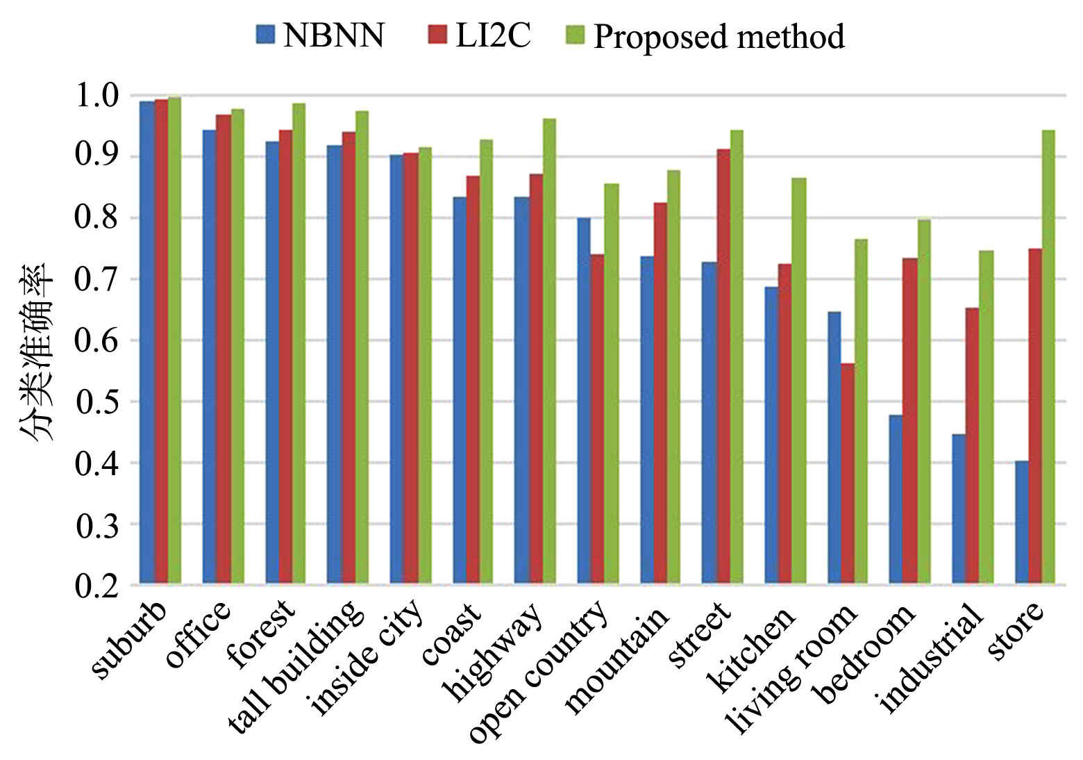 | Fig.4 The comparison of per?category classification accuracy of three methods on Scene?15 dataset |