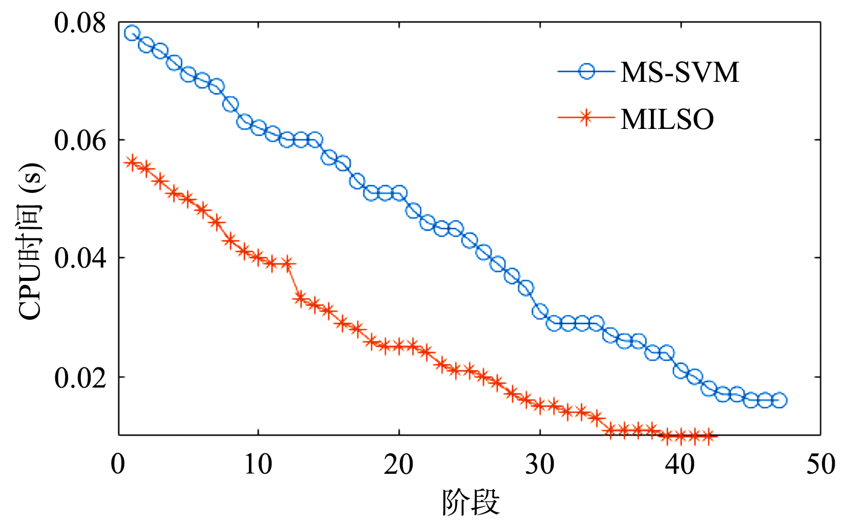 | 图5 MILSO 和MS?SVM在数据集A9a上的每个阶段所用的CPU时间 |