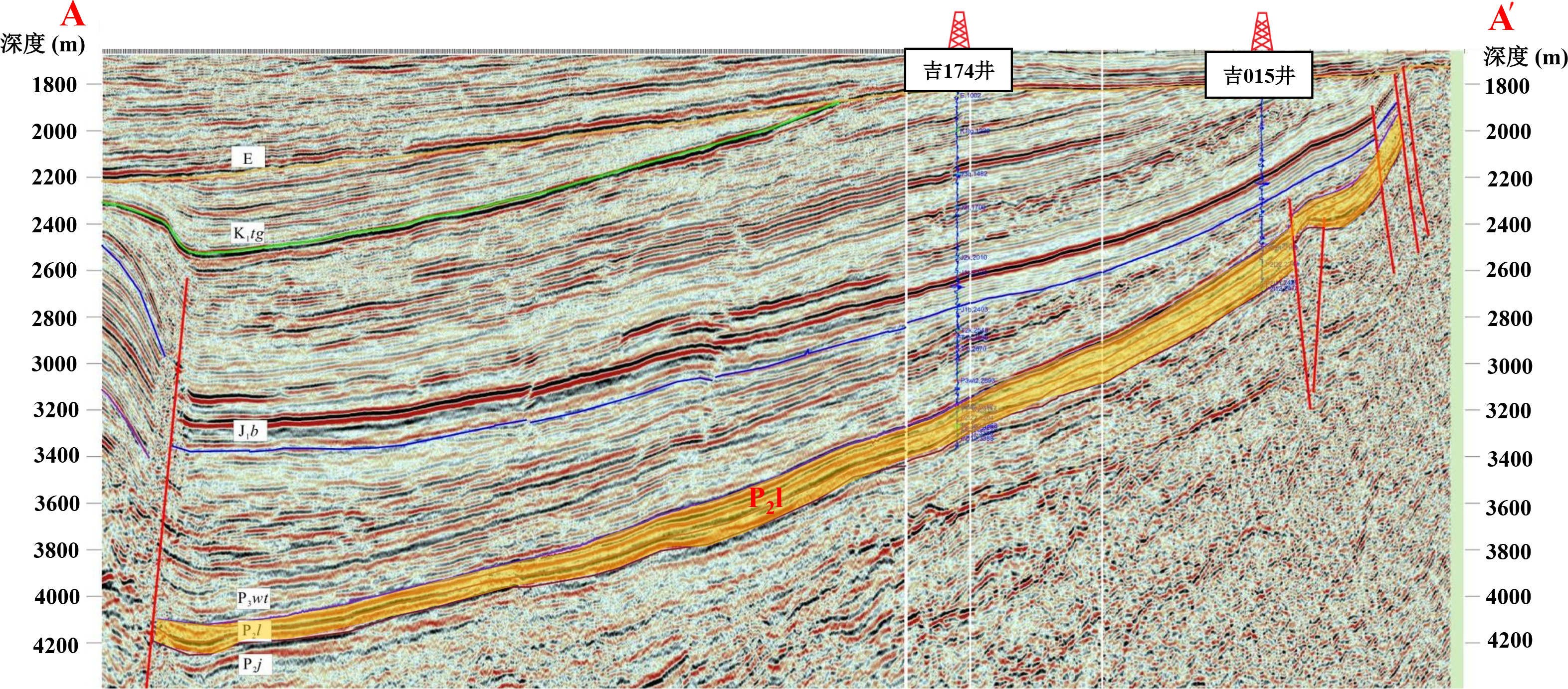 | 图2 吉木萨尔凹陷地层与构造基本格架地震剖面 P2j=二叠系井井子组,P2l=二叠系芦草沟组,P3wt=二叠系梧桐沟组,J1b=侏罗系八道湾组,K1tg=白垩系吐谷鲁群,E=古近系.剖面位置参见 |