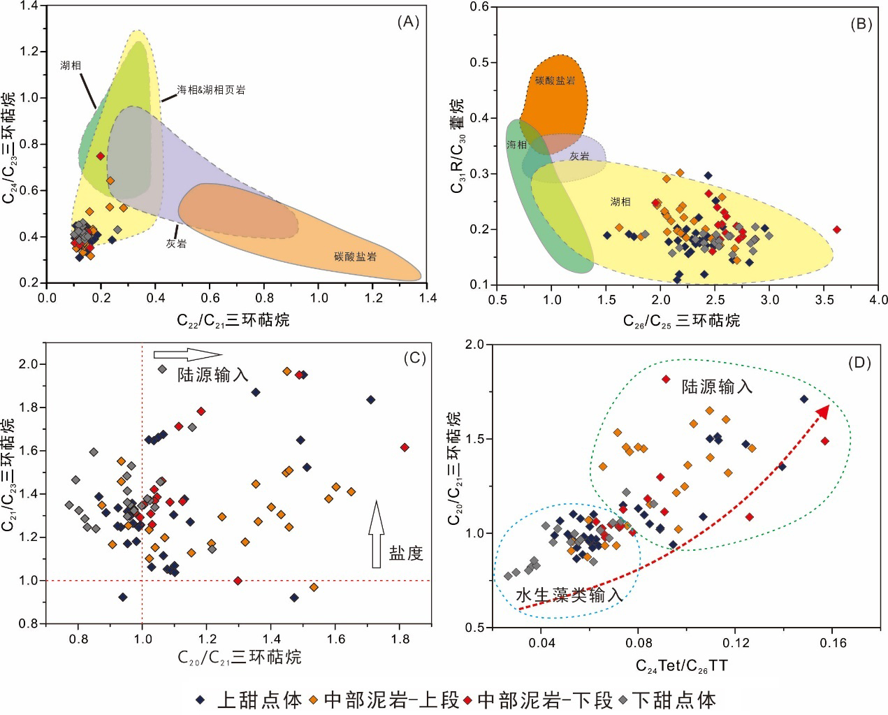 | 图7 吉174井芦草沟组烃源岩样品萜烷类化合物关系图 (A) C22/ C21三环萜烷比值和C24/C23三环萜烷比值相关关系;(B) C31R/C30藿烷与C26/C25三环萜烷相关关系; (C) C20/C21三环萜烷比值与C21/C23三环萜烷比值相关关系;(D) C24Tet/C26TT与C20/C21三环萜烷比值相关关系 |