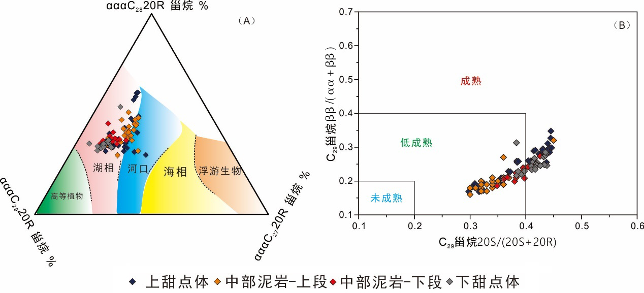 | 图8 吉174井烃源岩甾烷类化合物特征 (A) αααC27?C2920R甾烷三元图;(B) 甾烷成熟度关系 |