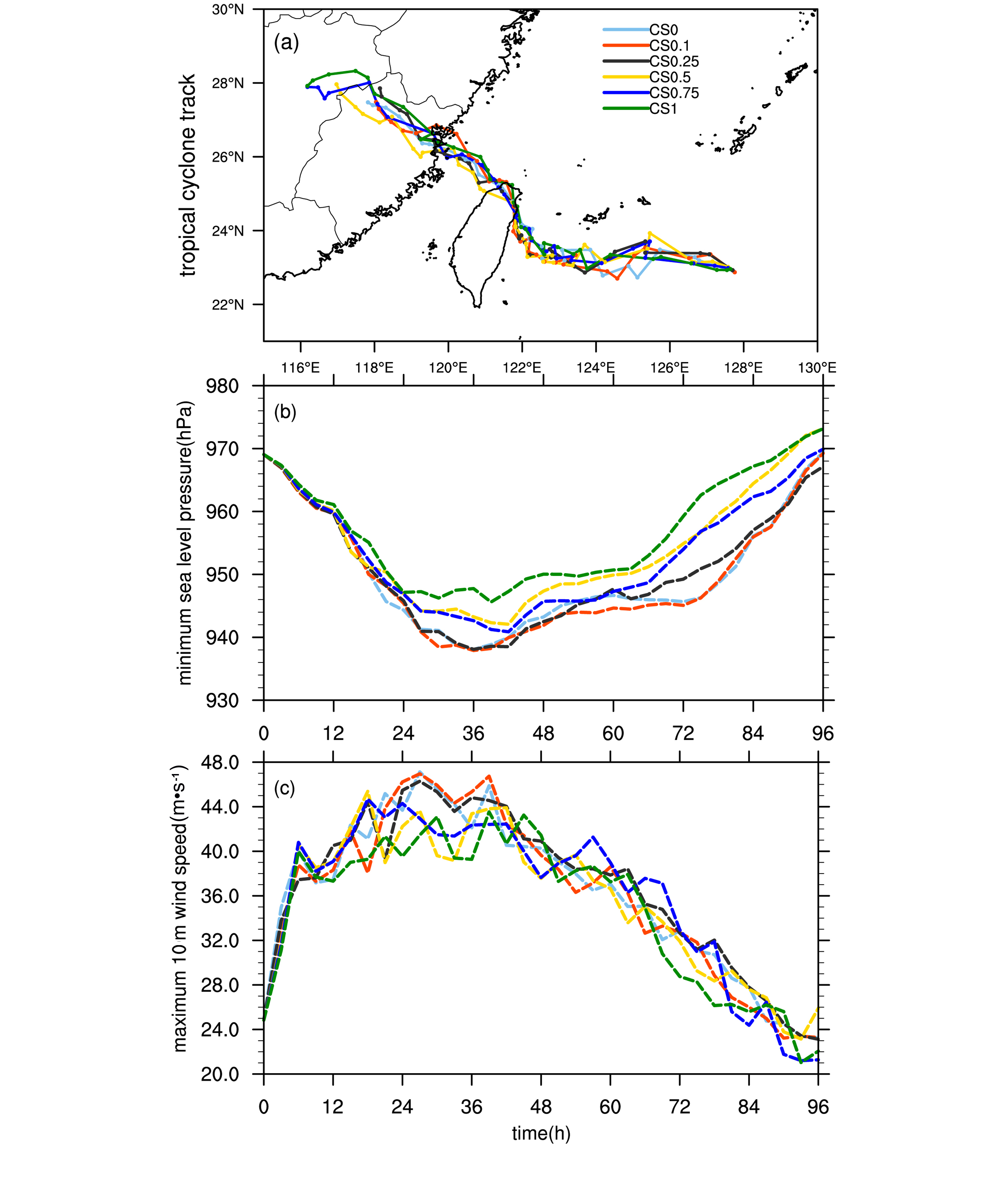 | 图3 莫拉克(2009)台风六组对比实验模拟的2009年8月6日00时至8月10日00时的路径和强度 (a) TC tradk,(b) minimum sea level pressure(unit: hPa),(c) maximum wind speed of 10 m height (m?s-1) |