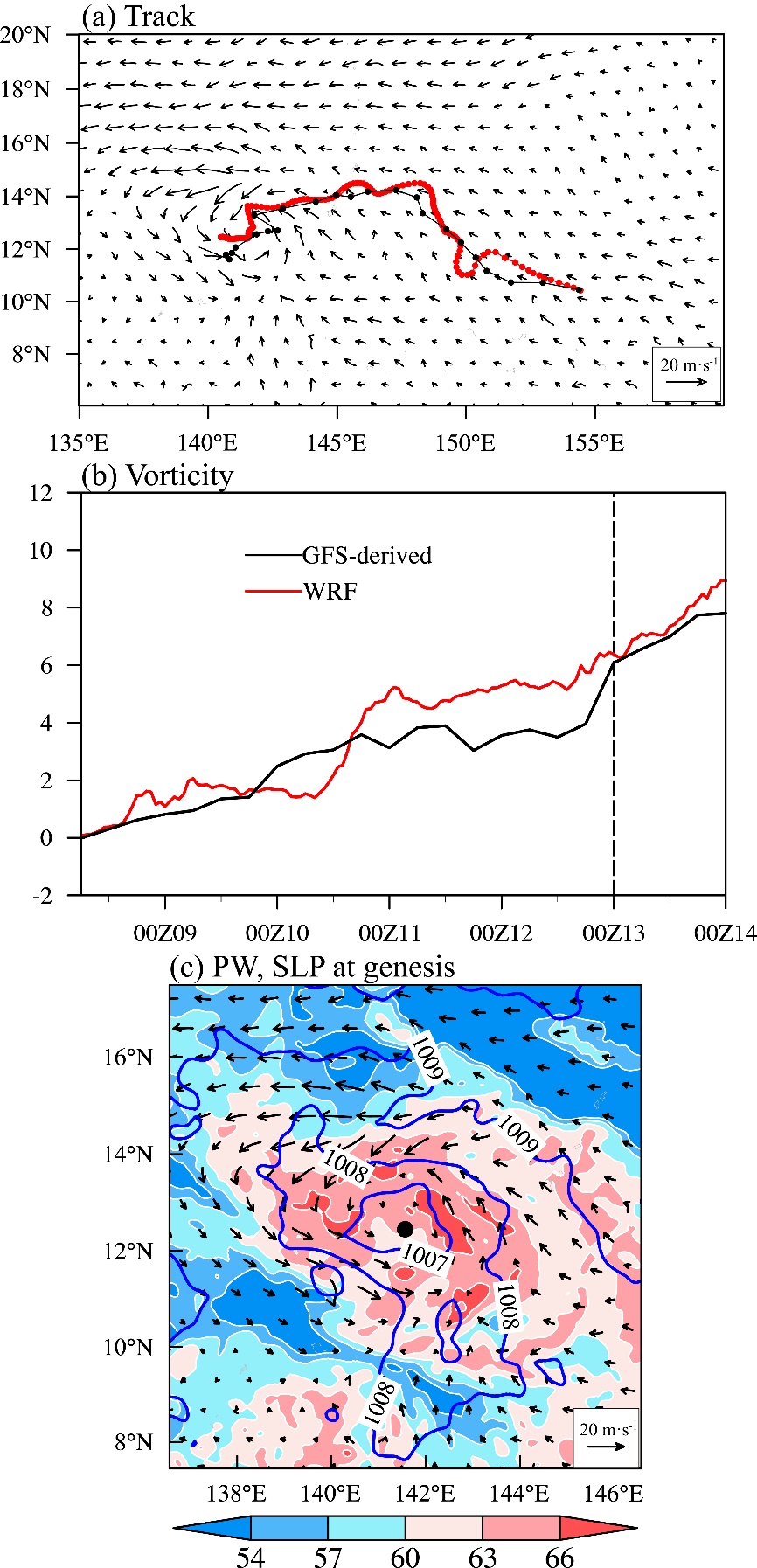 | Fig.1 (a) Model?derived (red circles) and GFS?derived (black circles) tracks of the disturbance,overlaid by the simulated 1000 hPa wind (vectors) at 0000 UTC 13 October,the location of the disturbance is defined as the centroid of the average vorticity from 1000 to 600 hPa,(b) area?mean vorticity (units: 10-5 s-1) at 850 hPa within 200 km radius of the disturbance center,the vertical dashed line denotes the genesis time (0000 UTC 13 October,from the JMA),(c) precipitable water (shading, units: kg?m-2) overlaid by the sea level pressure (lines, units: hPa) and 1000 hPa winds (vectors) at 0000 UTC 13 October,the black dot denotes the center of the disturbance |