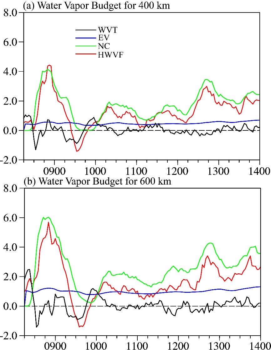 | 图5 与图2a类似,但针对半径400 km(a)和600 km(b)区域内总水汽含量的变化率(WVT)以及水汽通量水平辐合项(HWVF)、海洋蒸发(EV)和凝结项(NC)随时间的变化(单位:107 kg?s-1) |