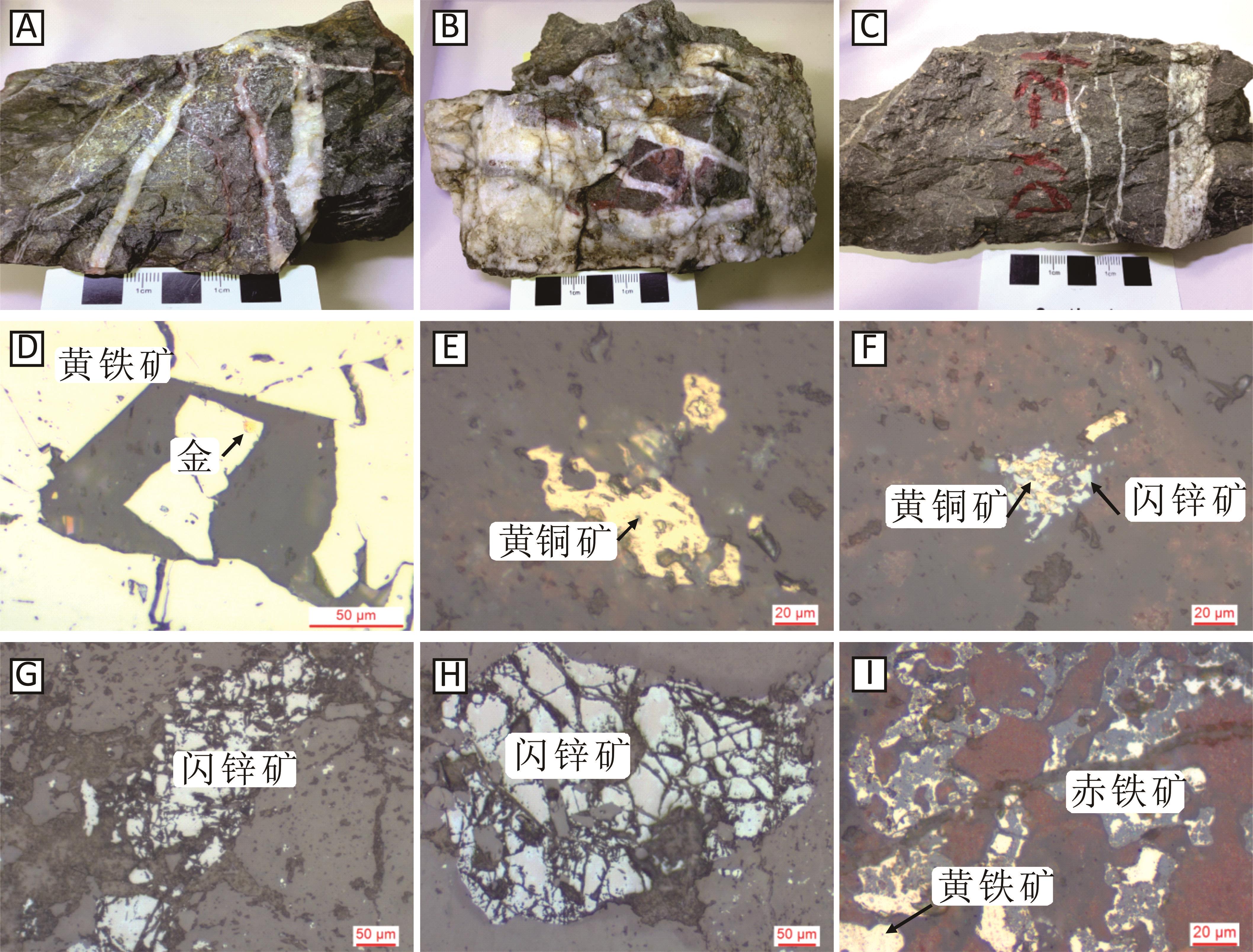| 图4 东溪金矿手标本及显微镜下的典型矿物组合 (A~C) Mineralization of quartz and calcite veins,(D) pyrite containing natural gold,(E) hypidiomorphic texture of chalcopyrite in quartz vein,(F) chalcopyrite metasomatised by sphalerite,(G,H) sphalerite in quartz vein,(I) pyrite metasomatised by hematite,representing the oxidizing environment |