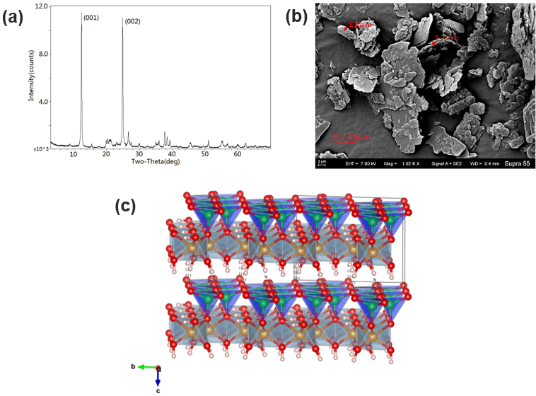 | 图1 高岭石的XRD图谱(a),SEM图像(b)和晶体结构(c) |