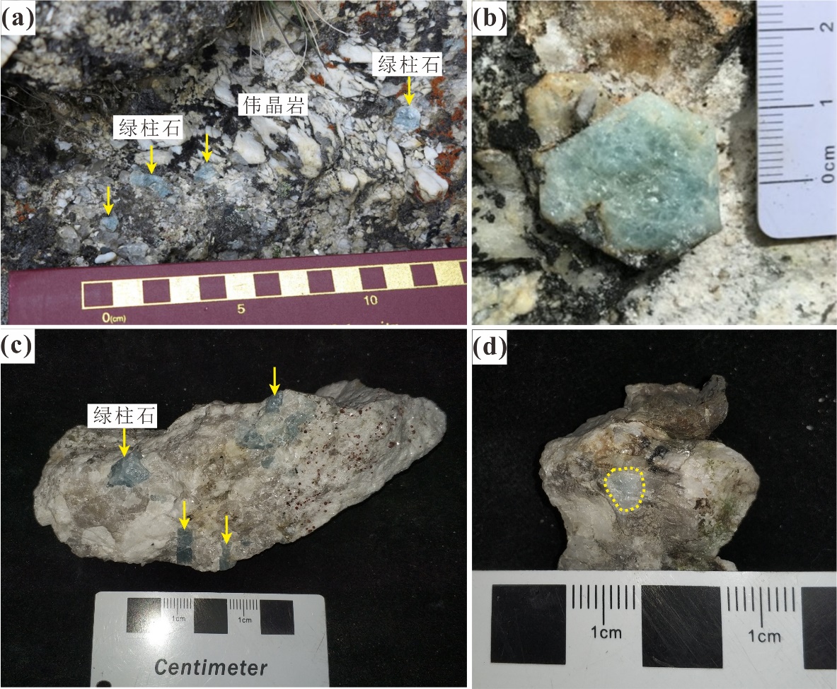 | 图3 喜马拉雅花岗岩?伟晶岩中绿柱石样品的野外及手标本图片 (a) In the Cuonadong pegmatite,transparent and aquamarine blue,(b) in the Cuonadong pegmatite,hexagonal prism,(c) in the Kuqu pegmatite,(d) in the Qianjinggou lepidolite?bearing pegmatite |
