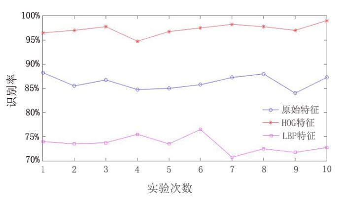 采用不同的特征提取算法提取东巴文特征向量,之后输入支持向量机进行分类识别.实验分别提取图像的原始特征(64×128维特征向量)、HOG特征、局部二值模式(Local Binary Patterns,LBP)特征,10次实验结果如图5 所示.
