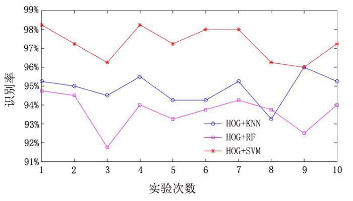 在图像预处理中采用Roberts算子进行边缘检测;打乱HOG特征提取后的数据集,并随机选取80%作为训练集,20%作为测试集;对每次随机生成的东巴文样本分别用SVM,K最近邻分类器(K⁃Nearest Neighbor,KNN)以及随机森林(Random Forests,RF)进行分类识别.完整的实验过程如图6 所示,图7 为不同分类器的10次实验结果对比图.