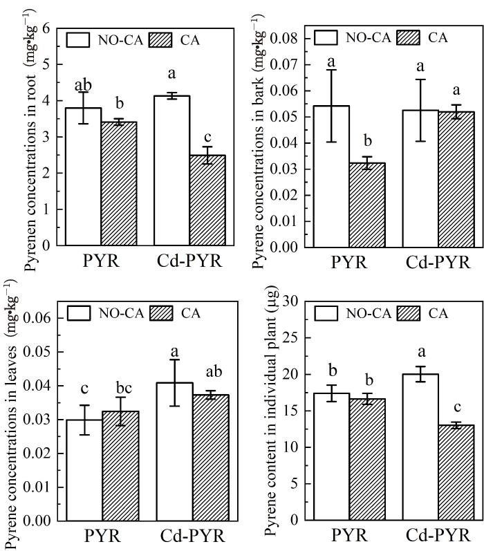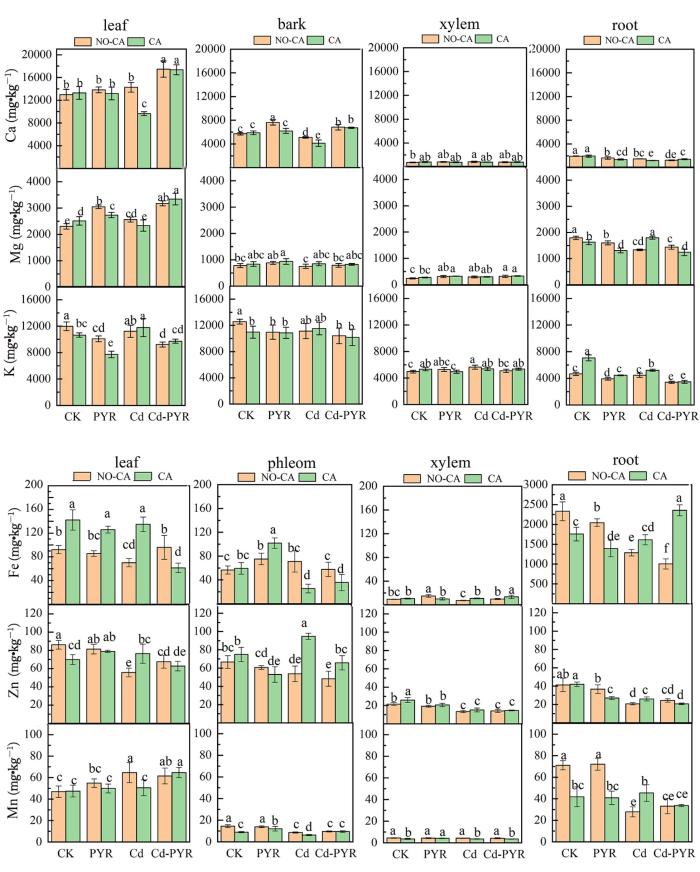 矿质元素对植物的生长发育十分重要,图7列出了Ca,Mg,K,Fe,Mn,Zn在柳树不同部位(根部、木质部、皮、叶片)的浓度对比.由图可知添加柠檬酸降低了柳树叶片中Ca,Mg,K,Mn含量,但提高了叶片Fe含量.柳树皮部必需元素Fe和Zn的分布受到柠檬酸影响较大,在单一Cd污染处理组中,添加柠檬酸使柳树皮部Zn浓度升高了77.4%.柠檬酸对柳树木质部矿质元素的分布影响较小,其影响趋势因元素的不同而有所差异.在柳树根部,矿质元素Fe和Mn浓度受到柠檬酸的显著影响,在单一PYR土壤中,矿质元素Fe和Mn的浓度分别减低了32.0%和43.0%,在Cd⁃PYR复合污染下,Fe浓度则升高了134.5%,Mn的差异不显著.