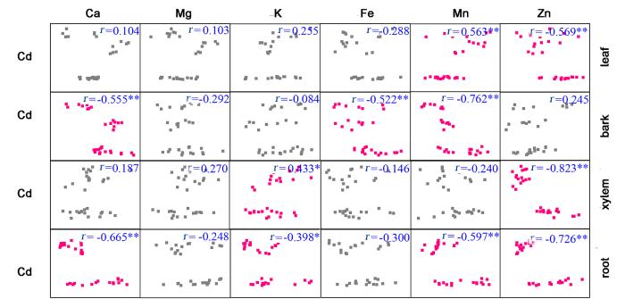 对柳树各部位的矿质元素与Cd的分布进行Pearson相关性分析发现,柳树根部、皮部、叶片的Cd浓度与Zn和Fe浓度存在极显著负相关(图8),说明柳树对Cd的吸收转运与锌的吸收转运存在拮抗效应;柳树皮和根中Cd的浓度与元素Ca,Fe,K,Mn的浓度也存在显著负相关,说明重金属Cd影响了柳树对矿质元素的吸收,对柳树产生了负面影响.