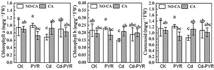 Cd、PYR单一和复合污染各处理组柳树叶片中叶绿素a、叶绿素b和类胡萝卜素如图9所示.在单一PYR污染土壤中,添加柠檬酸使柳树叶片中叶绿素a、叶绿素b和类胡萝卜素分别降低了27.8%,19.9%和27.6%,而在单一Cd污染土壤中,柠檬酸使柳树叶片中叶绿素a、叶绿素b和类胡萝卜素分别提高了35.1%,38.5%和35.0%,在CK和Cd⁃PYR复合污染土壤中,柠檬酸对光合色素含量没有显著影响.