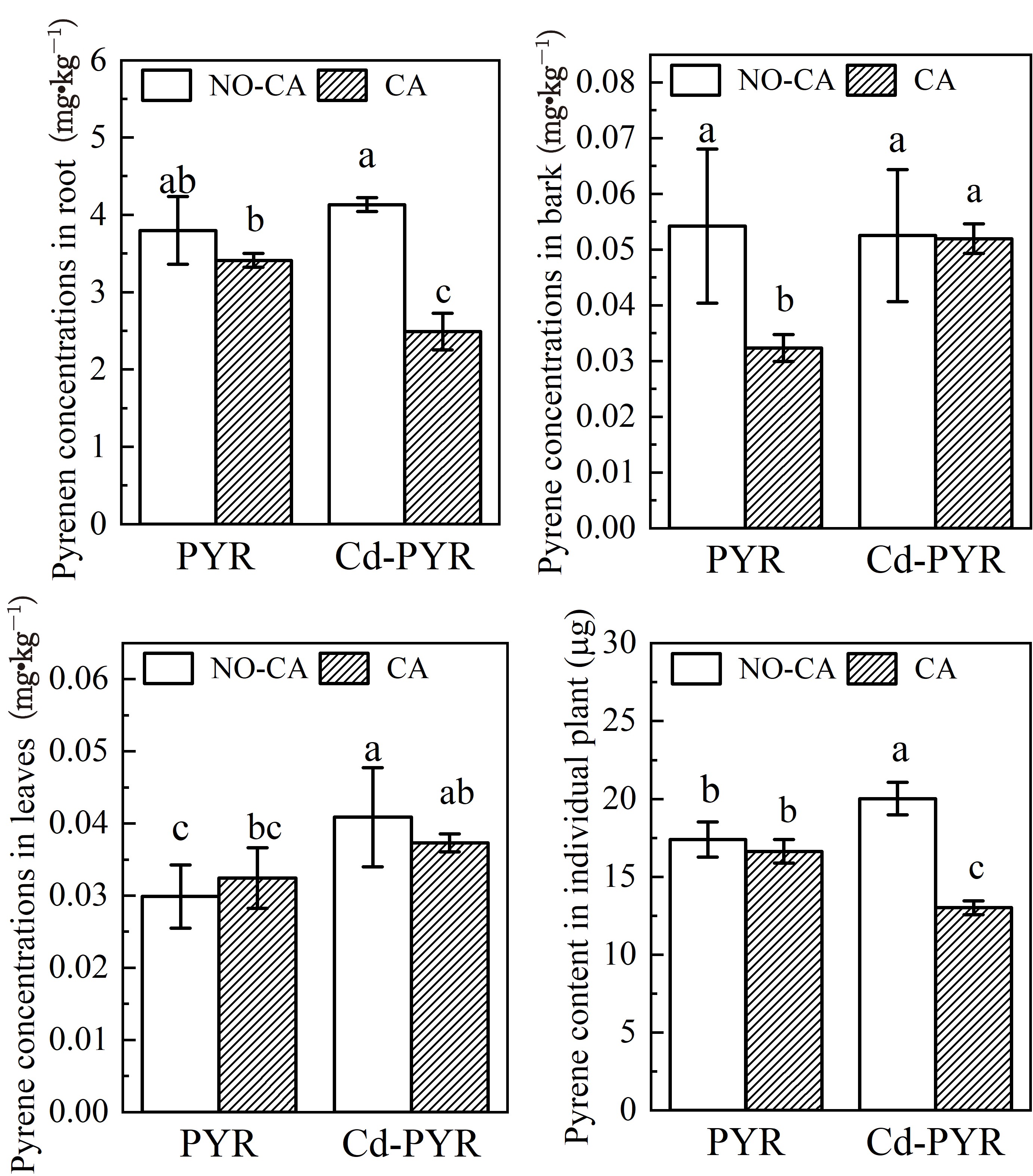 | 图3 柠檬酸对柳树富集PYR的影响 n=4,不同字母表示显著差异,p<0.05,NO?CA表示未添加柠檬酸组;CA表示添加柠檬酸组 |