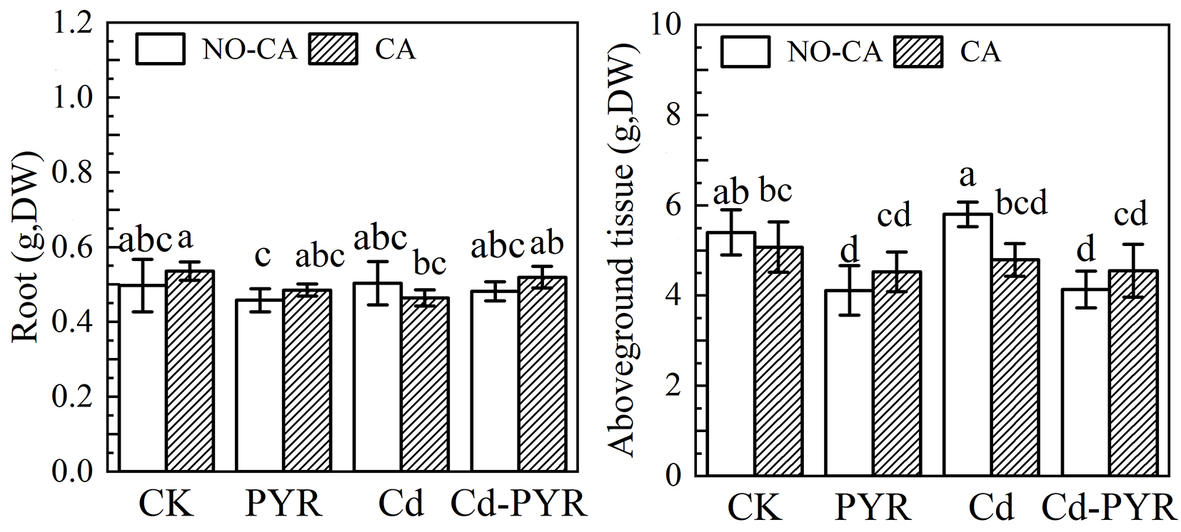 | 图6 柳树地上部和根部的生物量干重 n=4,不同字母表示显著差异,p<0.05,NO?CA表示未添加柠檬酸组;CA表示添加柠檬酸组 |
