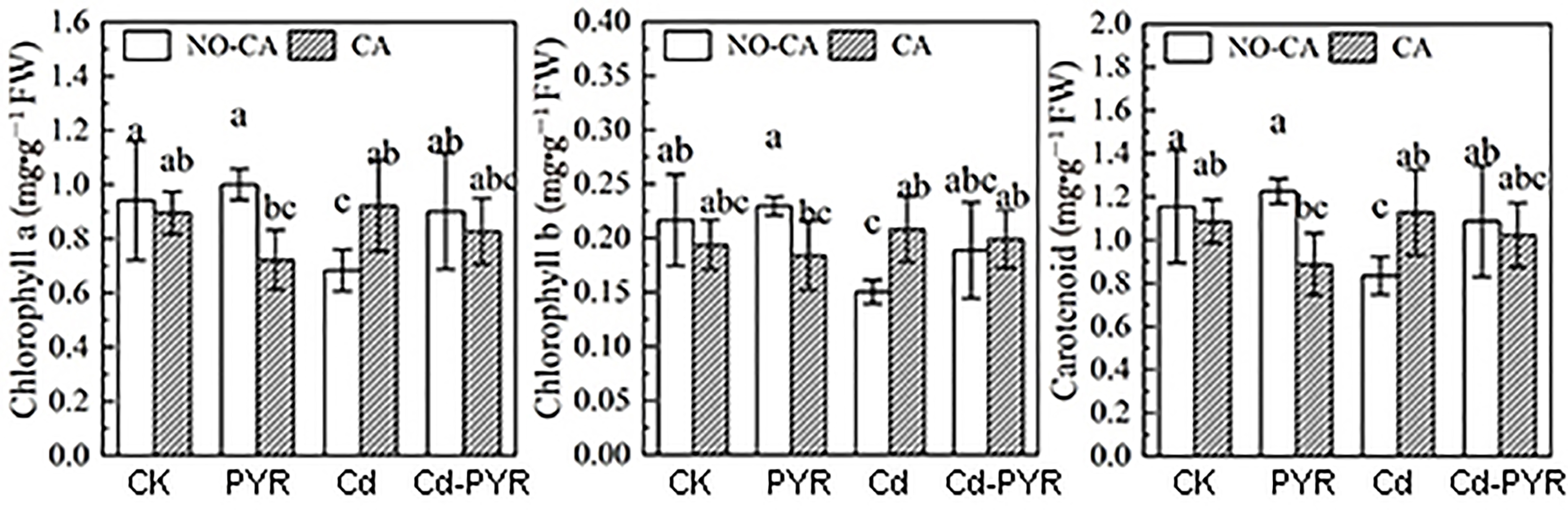 | 图9 柠檬酸对柳树叶片中色素的影响 n=4,不同字母表示显著差异,p<0.05,NO?CA表示未添加柠檬酸组;CA表示添加柠檬酸组 |