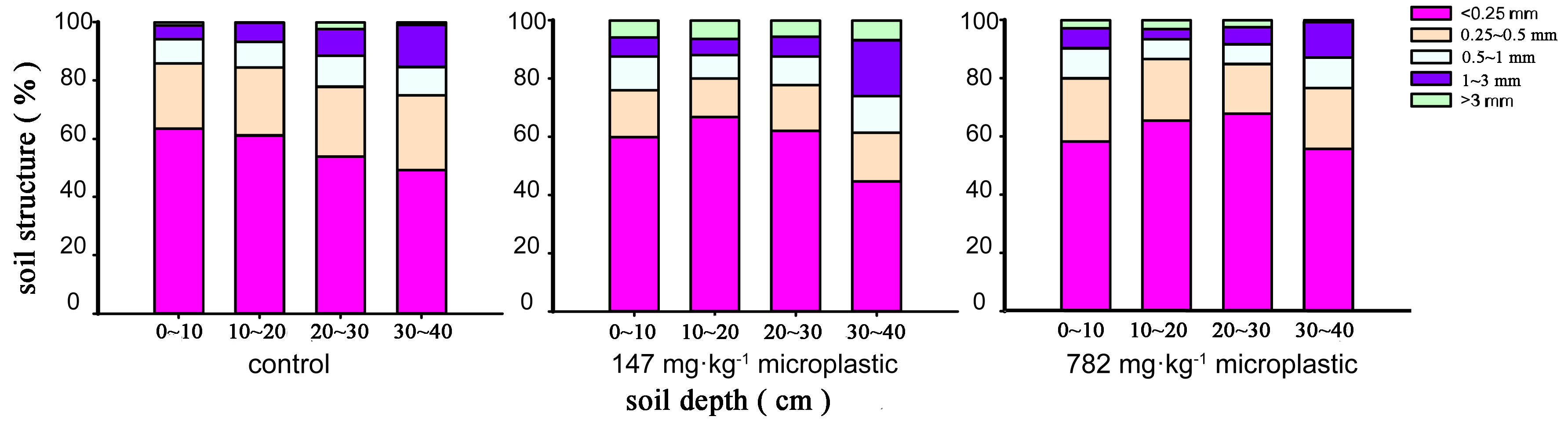 | Fig.3 Soil structure at different depths (0~10,10~20,20~30,30~40 cm) in the control,147 mg·kg-1 microplastic and 782 mg·kg-1 microplastic treatment (Data are means of three replicates) |