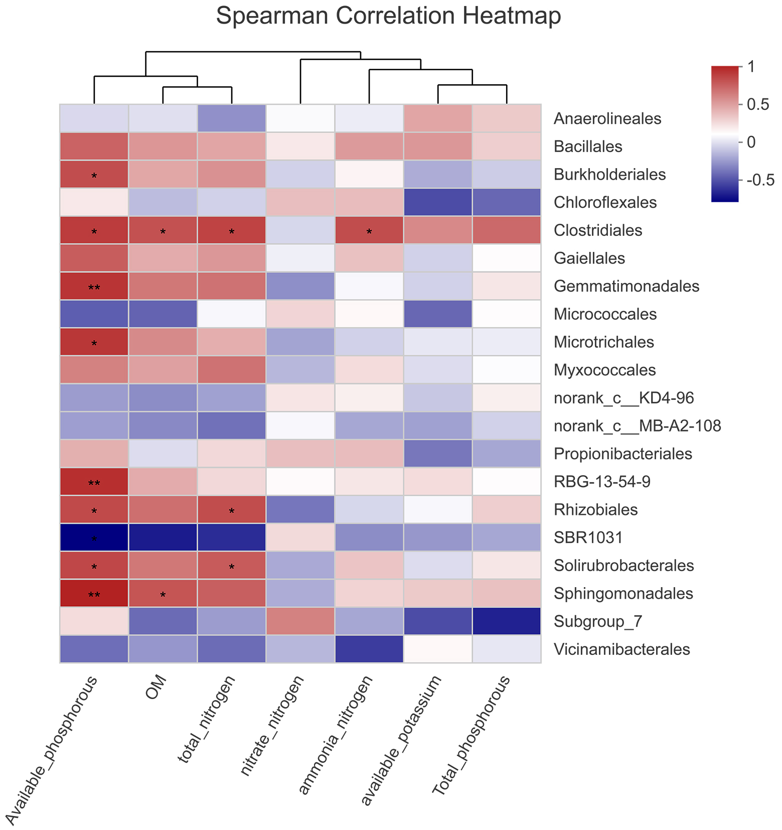 | Fig.5 Spearman correlation analysis based on the relative abundances of bacterial orders and soil nutrient indexes |