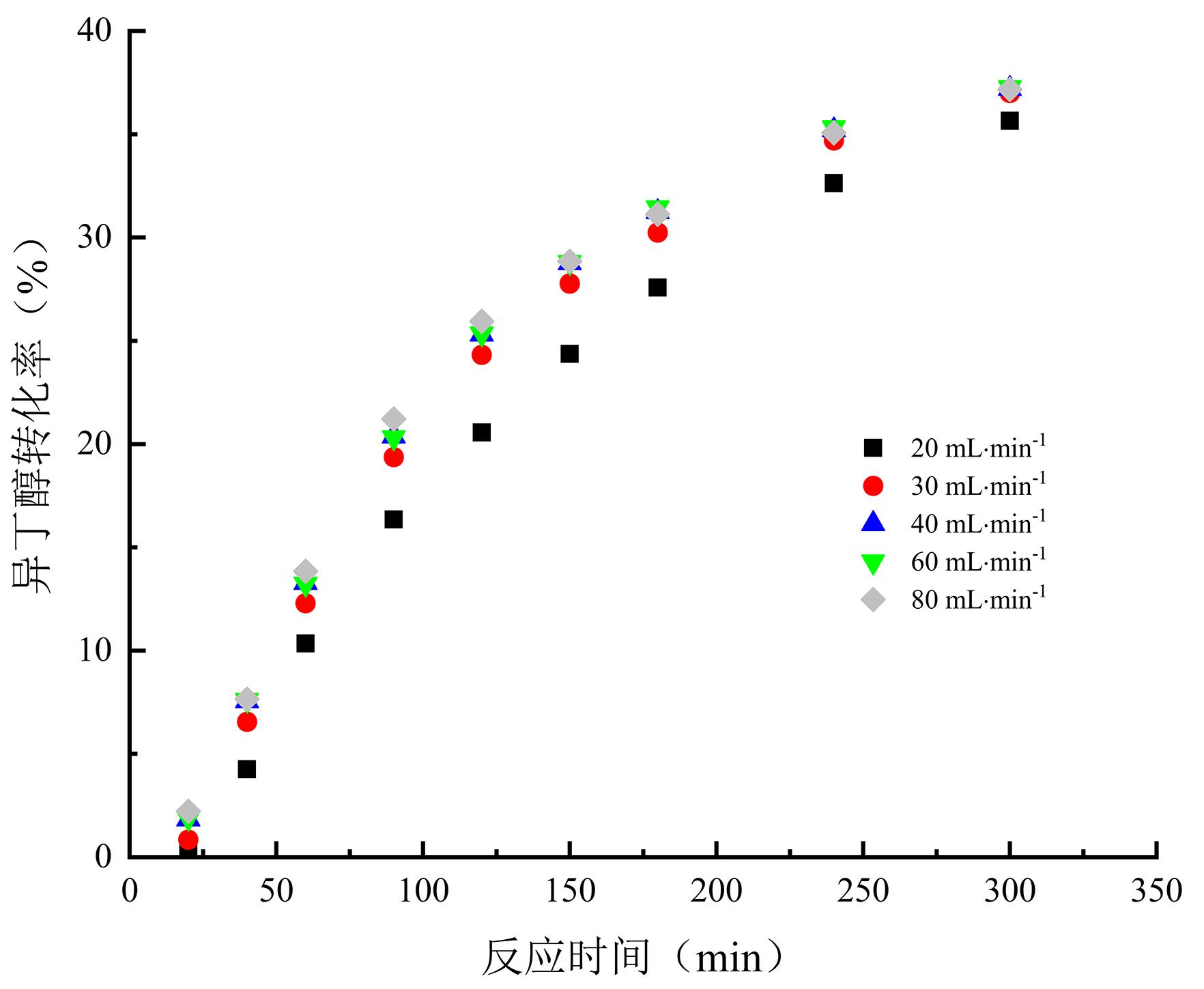 | Fig.2 Influence of of volume flow rate on conversion rate of isobutanol |