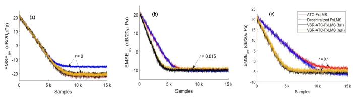 ... 扩散控制本质上是对多个单通道ANC算法进行平滑,在提高稳定性能的同时,会带来控制器的估计偏差[16-17],直接影响降噪量.扩散控制系统中,每个控制器首先利用自身节点接收到的本地误差信号对滤波器进行更新.与分散控制类似,由于不考虑其他节点优化,该更新步骤的计算量与分散控制一样.与分散控制不同的是,扩散控制进一步将这些局部估计加权组合,从而改进系统性能[18].可以看出,扩散控制既节省了巨大的计算负担,另一方面通过节点之间的通信,可以增加系统的稳定性.在为数不多的扩散ANC系统多任务问题的研究中,Chu et al[7]从理论上分析了扩散控制的估计偏差与方差.本文从Chu et al[7]的理论工作出发,旨在开发一种新的Diff⁃FxLMS算法,使得该算法可自动调整扩散强度,以平衡系统稳定性和控制器估计精度之间的矛盾[19].与使用固定组合权重的传统Diff⁃FxLMS算法相比,新算法引入了一个可变参量,称为空间正规化(Spatial Regularization,SR)因子[20],用于调整扩散强度.在探索了系统响应和声学路径平滑度的基础上,新算法通过平滑约束提出局部代价函数.由此,一种新型的可变SR(Variable SR,VSR)更新公式自然而然地产生于平滑约束,形成一类VSR⁃Diff⁃FxLMS算法.进而对新算法的均值性能进行了分析,理论解释SR对ANC网络的影响以及改进方法的可行性. ...