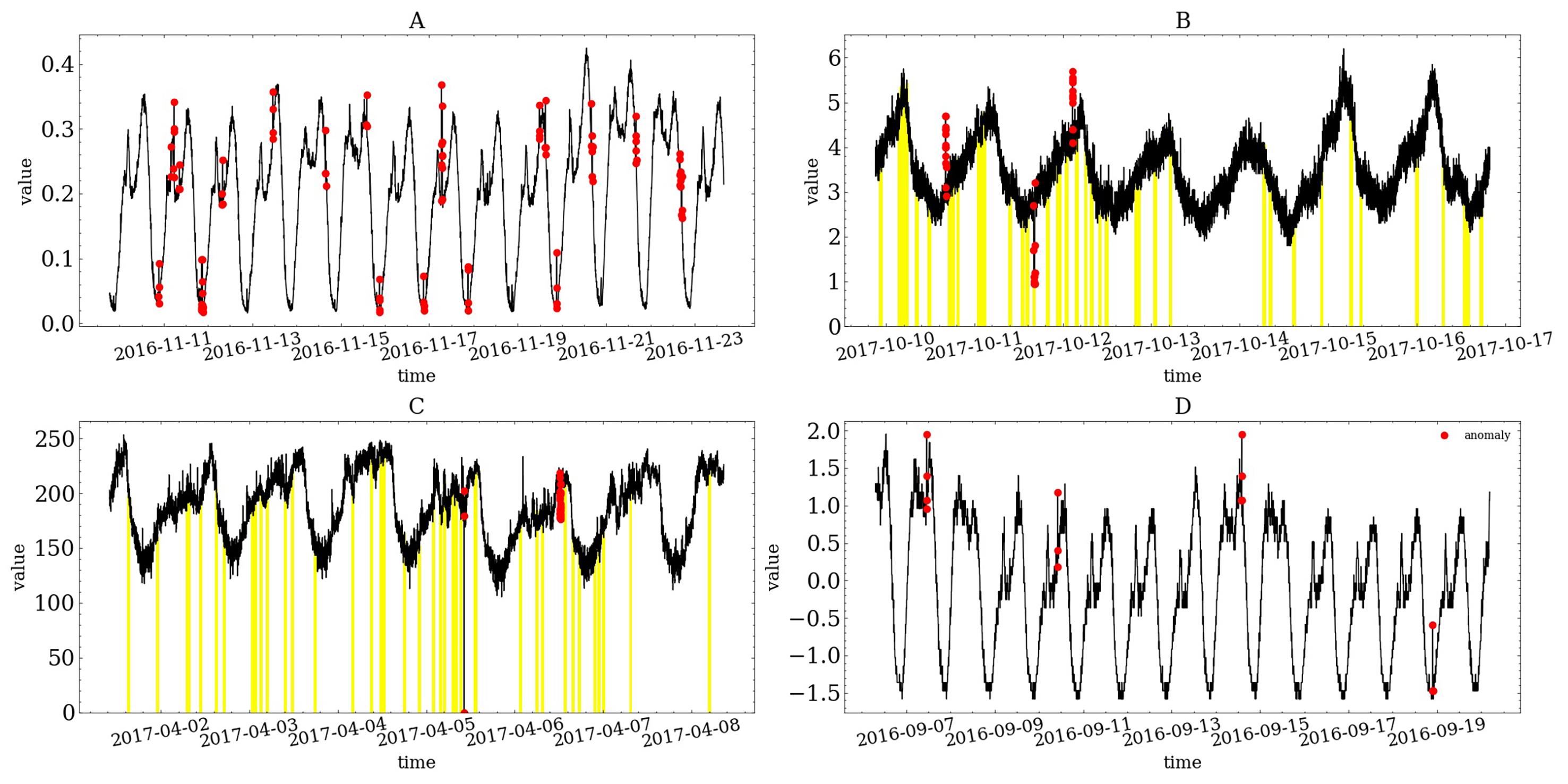 | 图3 本文所用时间序列数据(红色标注异常,黄色标注缺失) |
