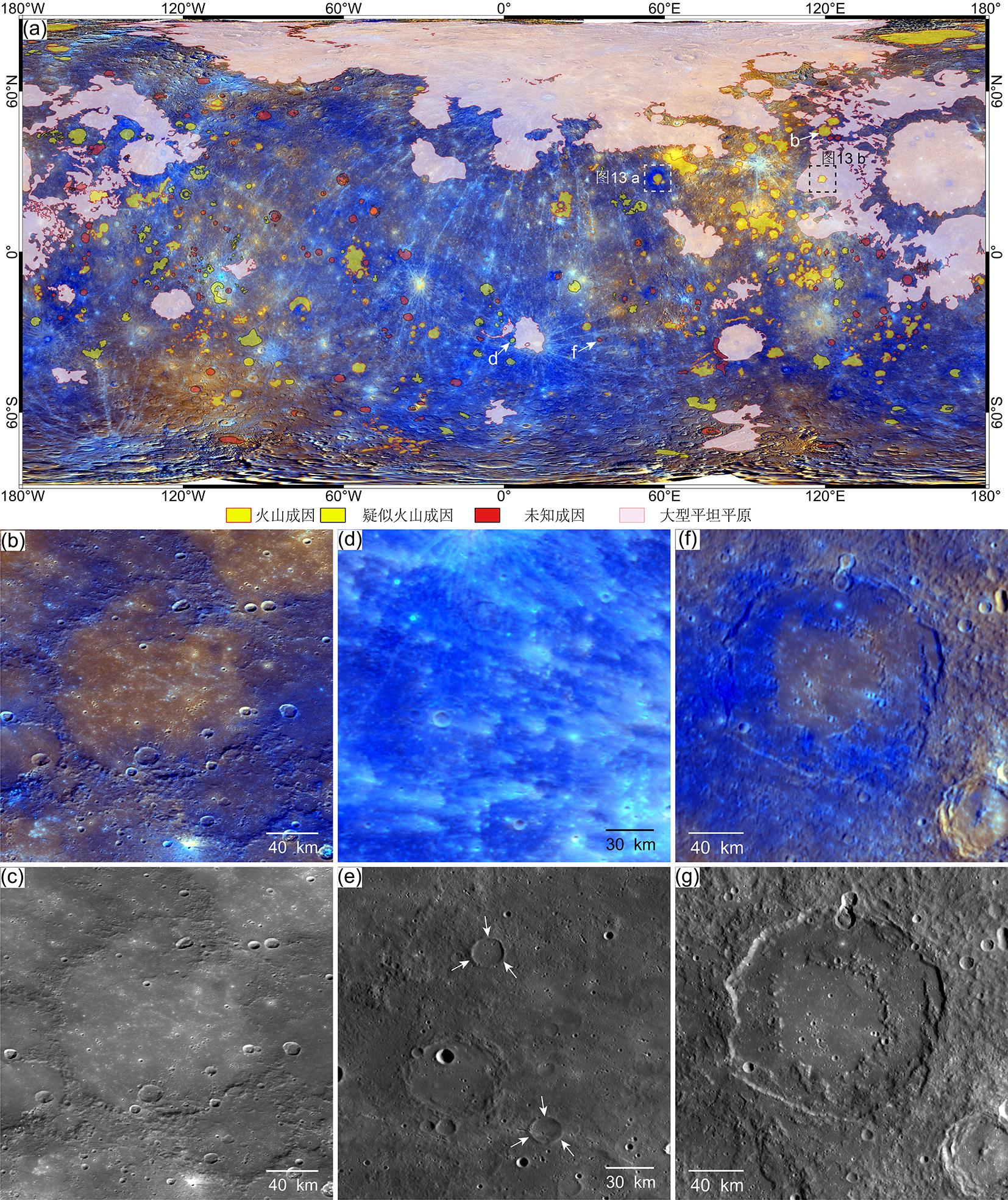 | 图5 全球平坦平原分布[ (a)水星表面不同成因平坦平原的全球分布特征;(b,c)达利撞击坑(45.2°N,119.7°E)内部火山成因的平坦平原;(d,e)杜尔姆斯平原(31.1°S,9.2°E)内疑似火山成因的平坦平原,(e)中白色箭头指示幽灵撞击坑;(f,g)纳博科夫撞击坑(14.6°S,55.7°E)内未知成因的平坦平原 |