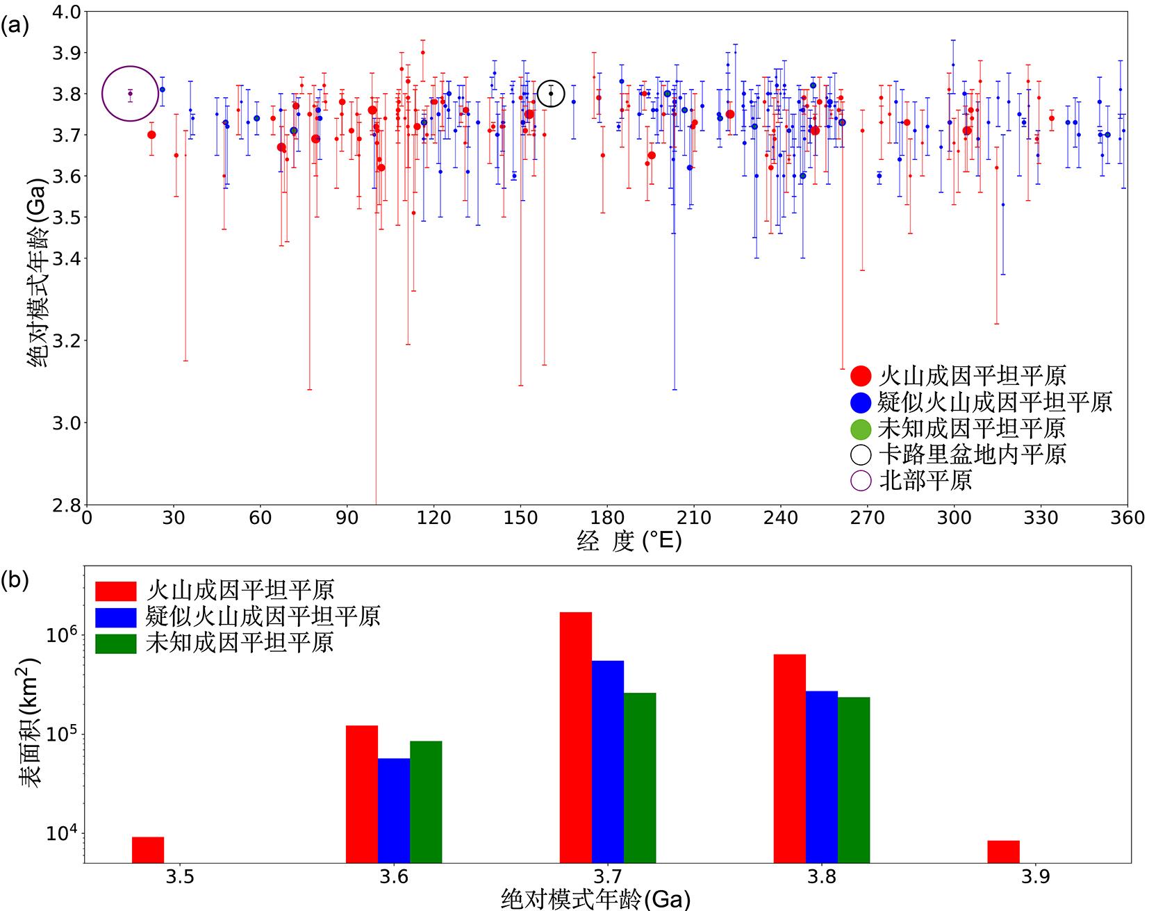 (a)平坦平原中央经度?年龄分布图,圆圈直径等比例对应平坦平原的面积;(b)不同成因平坦平原的年龄分布柱状图