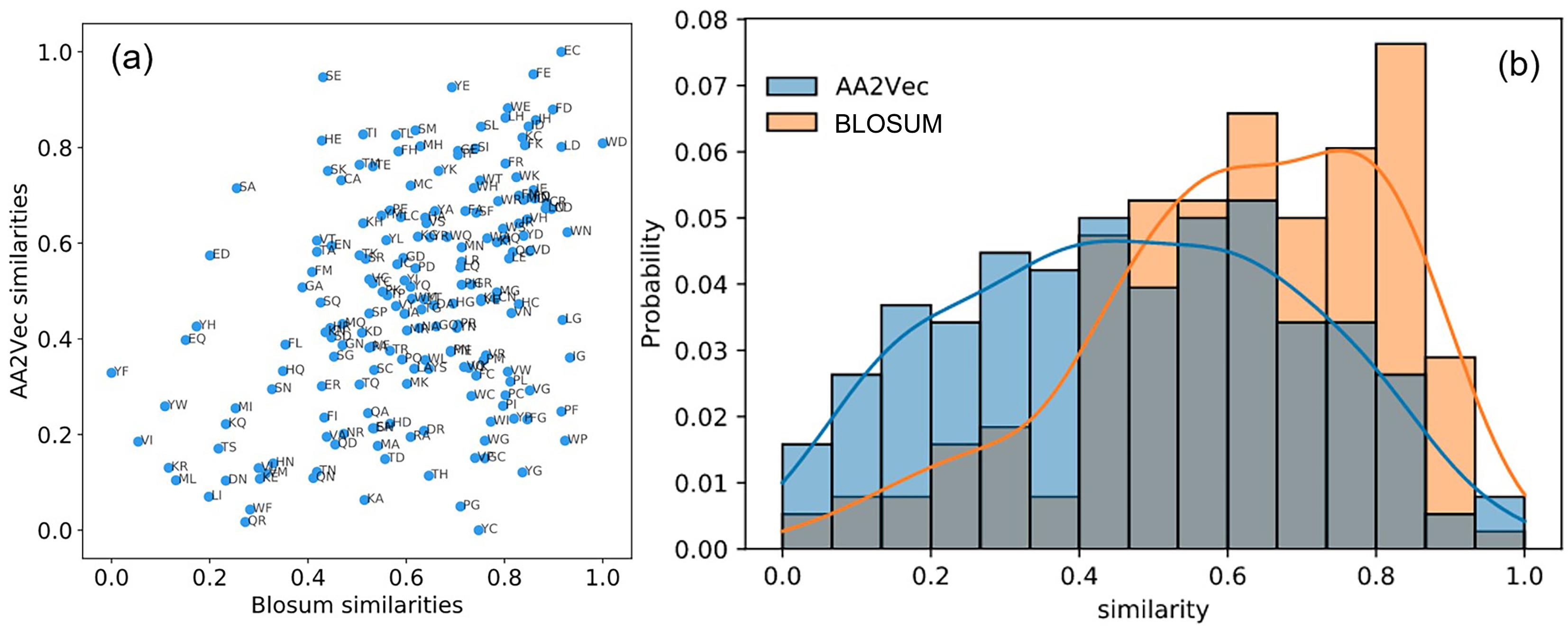 | 图5 AA2Vec和非取整BLOSUM62的相似性对比:(a) x轴为BLOSUM相似性,y轴为AA2Vec表示空间的相似性,每个蓝色点代表一个氨基酸对;(b) BLOSUM62和AA2Vec相似性的分布直方图 (b) the histogram of BLOSUM62 and AA2Vec distribution |