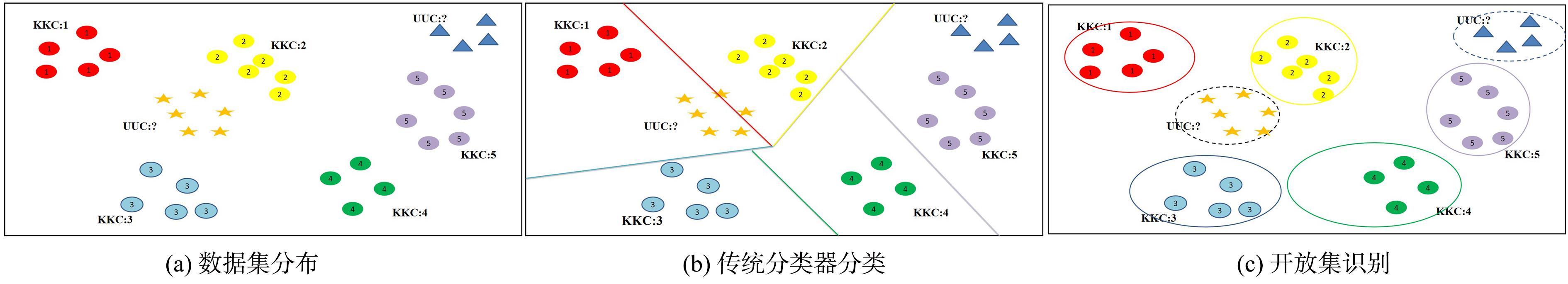 | 图1 传统分类器与开放集识别对比:(a)数据集的原始分布,包括五个KKCs和两个UUCs;(b)传统分类器的决策边界,其中UUCs会分到KKCs中;(c)开放集识别,能识别UUCs并单独分类 |