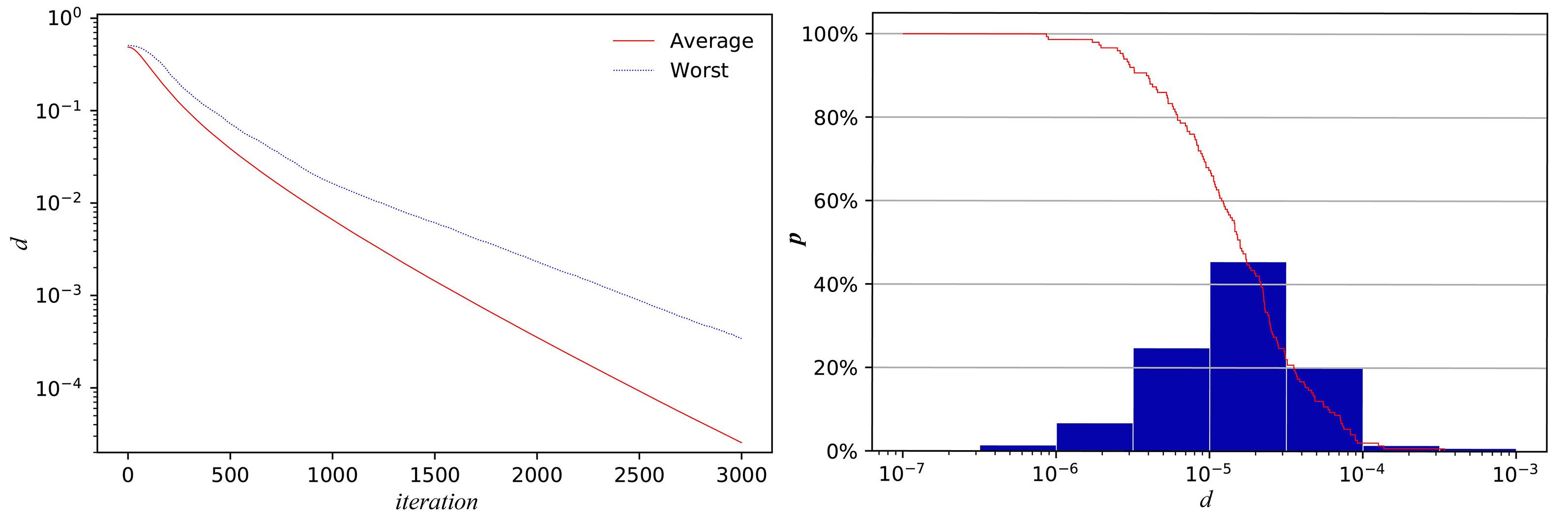 | 图5 利用随机梯度下降算法可以在位置空间实现任意两结果半正定算子测量 左图,横轴和纵轴分别对应于更新次数和距离.绘制的每条线都是平行取样训练的多个样本在同一更新次数下,距离(所需实现的量子操作 |