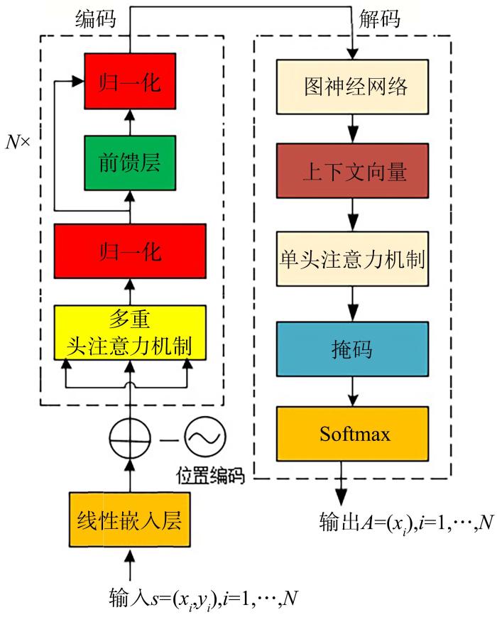 图的特殊结构可以承载更多的节点信息,因此可以通过低维的向量信息来表征图的节点及拓扑结构,这种方法可以很好地处理非欧几里得数据,让网络模型容易学习到有效的特征信息.鉴于此,2017年Dai et al[18]将DRL和GNN结合,提出S2V⁃DQN模型,求解大规模TSP问题.2019年Kool et al[19]基于Transformer结构[6],采用多重注意力机制(Multi Head Attention,MHA)的自注意力机制计算方法提取深层节点的特征信息,有效防止了节点信息的丢失,该模型与PN网络相比,泛化能力更好,训练速度更快.2019年Chen and Tian[20]提出NeuRewriter架构,通过DRL训练模型,以迭代的方式不断改进CVRP问题的解直到收敛.2020年Li et al[21]提出一种基于DRL解决多目标COP问题的框架(DRL⁃MOA),在PN网络中融入分解策略和邻居多参数传递策略,有效求解TSP问题.2021年Wu et al[22]提出一种直接策略的方法,通过self⁃注意力机制参数化策略模型,在模型训练阶段即可得到TSP和CVRP问题的解.2021年Xin et al[23]提出多重解码注意力模型(MDAM),求解多目标路径问题,并在编码中加入Embedding Glimpse层,提升了模型整体优化性能.