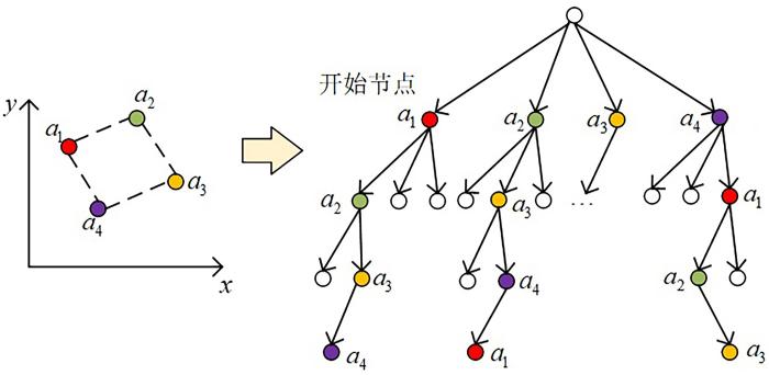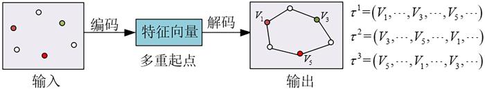 TSP问题的策略(式(2))以为起点与中任意起点得到的解是等价的,如果轨迹是一个最优解,那么轨迹也是一个最优解.图2展示了四个节点的多重选择.先前工作[14-20]只考虑单一最优路径,而本文类似Kwon et al[5],采用种不同的点序列表征最优解,模型在编码、解码、推理阶段均放置种不同的初始起点,其中每个节点都能被策略网络选取.实验结果显示多重轨迹的构造可以防止陷入局部最优,能更有效地寻求最短路径,行为网络通过蒙特卡洛方法(Monte Carlo method)采样种不同初始起点的轨迹,其中,每个轨迹被定义为(M为节点个数):
