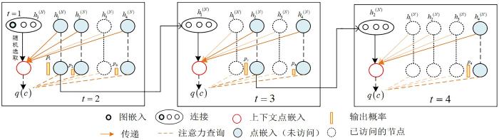 下一个解码阶段,类似Kool et al[19],引入上下文节点,经过多重起点随机选择初始节点后,加入遮掩技术(访问过的节点不能再次被访问),有效计算编码后节点的注意力分配,以较大概率输出下一个访问的城市节点.图3展示了最优路径的构造过程.具体地,通过水平拼接操作将编码层的图嵌入、初始节点、先前节点聚合成一个三维向量,记作,描述为: