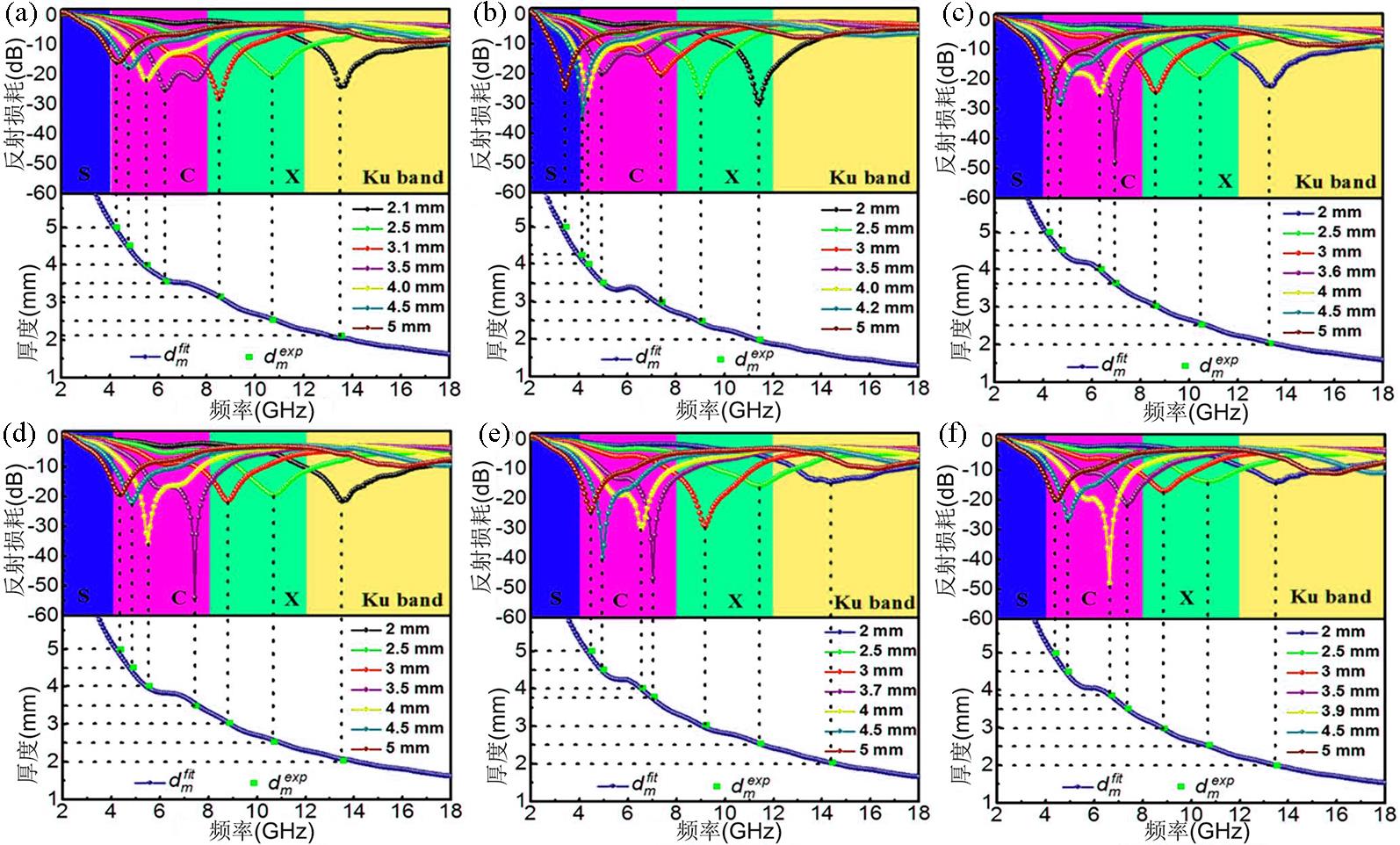 | 图2 (a) GF800,(b) NGF700?0.6,(c)NGF800?0.3,(d) NGF800?0.6,(e) NGF800?0.9和(f) NGF800?1.2的反射损耗曲线、匹配厚度与频率的关系图[ |