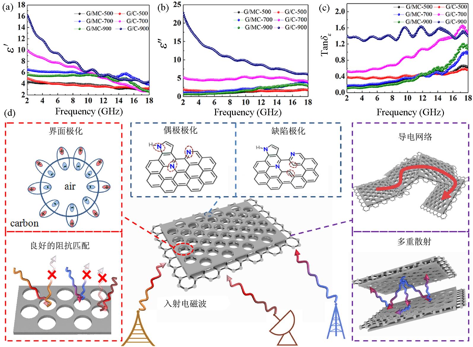 | Fig.5 The real part (a) and imaginary part of permittivity (b) as well as the dielectric loss tangent (c) of G/C and G/MC,schematic diagram of microwave absorption mechanism of G/MC?900 composites (d) (after ref.[ |