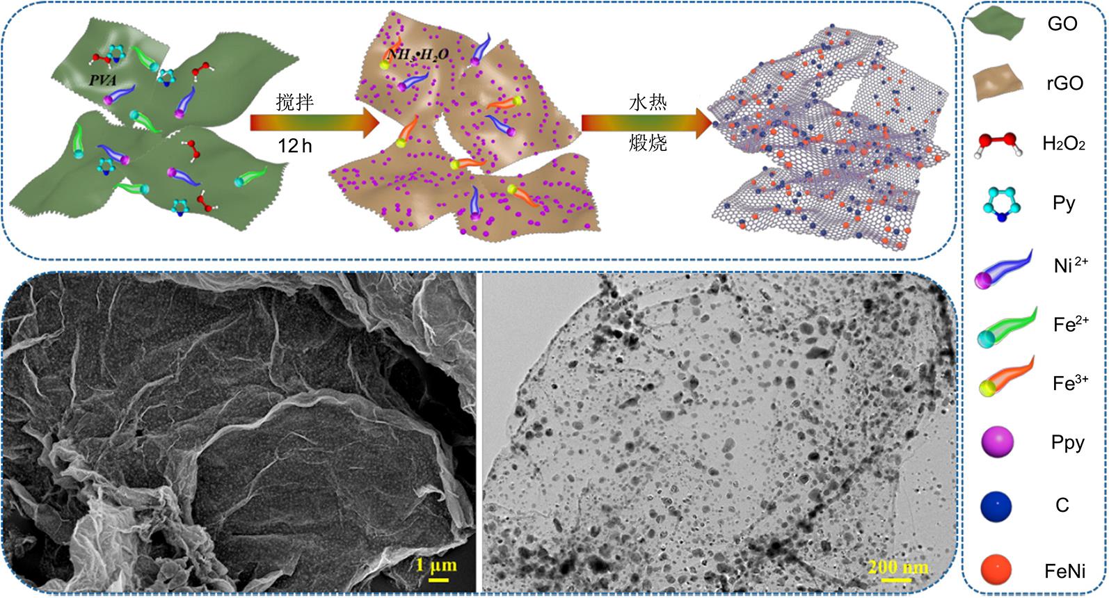 | Fig.6 The preparation procedure of RGO/N?C/FeNi hybrids,SEM image and TEM image of as?synthesized RGO/N?C/FeNi hybrid (after ref.[ |