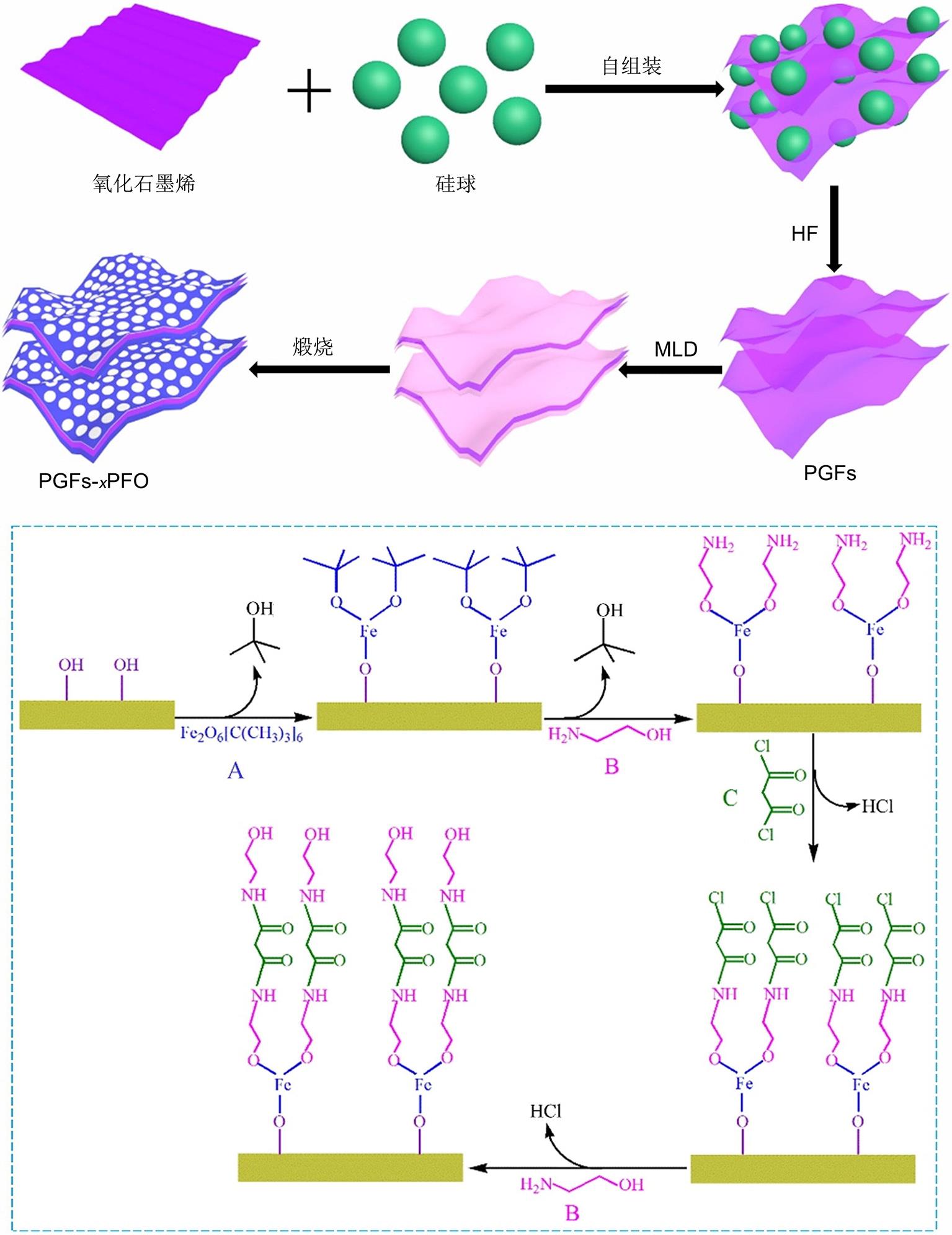 | 图8 以叔丁醇(Fe2(tBuO)6,前驱体A),乙醇胺(EA,前驱体B),丙二酰氯(MC,前驱体C)和乙醇胺(EA,前驱体B)为前驱体,采用ABCB四步法合成PGFs?xPFO和Fe杂化膜生长的示意图[ |