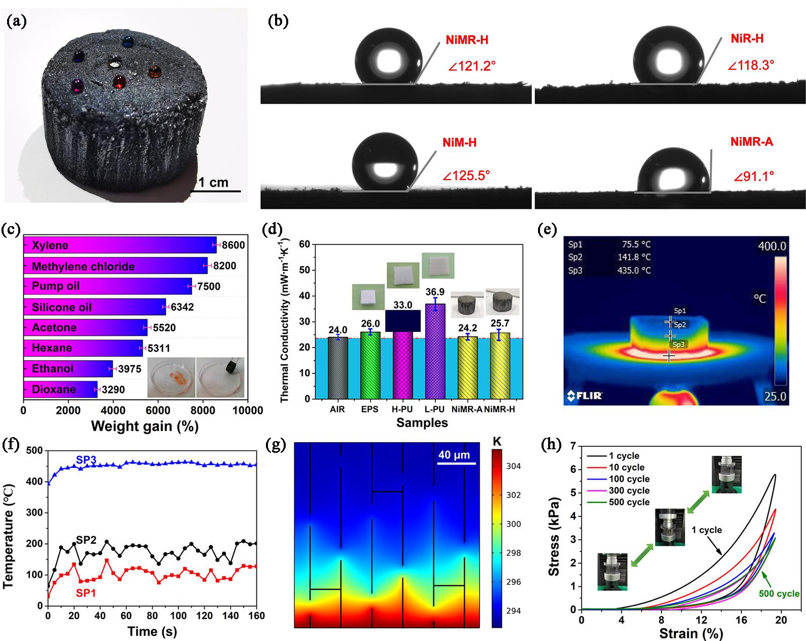 | Fig.12 (a) Digital photo of water droplets standing on a NiMR?H aerogel; (b) WCA images of NiMR?H,NiR?H,NiM?H,and NiMR?A aerogels; (c) absorption capacities of the NiMR?H aerogel for various organic liquids (inset shows the absorption process for hexane dyed by Sudan red Ⅲ); (d) thermal conductivities of EPS,high?density/low?density PU foams,and NiMR aerogels; (e) infrared thermal image of NiMR?H aerogel heating by an alcohol lamp and (f) corresponding temperature?time curves of the test points; (g) finite element simulation of the temperature change in the NiMR?H aerogel; (h) cyclic compressive stress?strain curves of the NiMR?H aerogel at 20% strain for 500 cycles (after ref.[ |