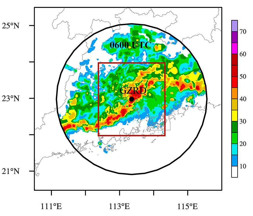 | 图1 广州雷达站点位置(GZRD)及观测范围图 The black circle represents the coverage with a radius of 230 km and the radar composite reflectivity of the bow echo (shading) at 06:00 (unit: dBZ) and the red box indicates the domain of 2°×2° centered on the radar site |