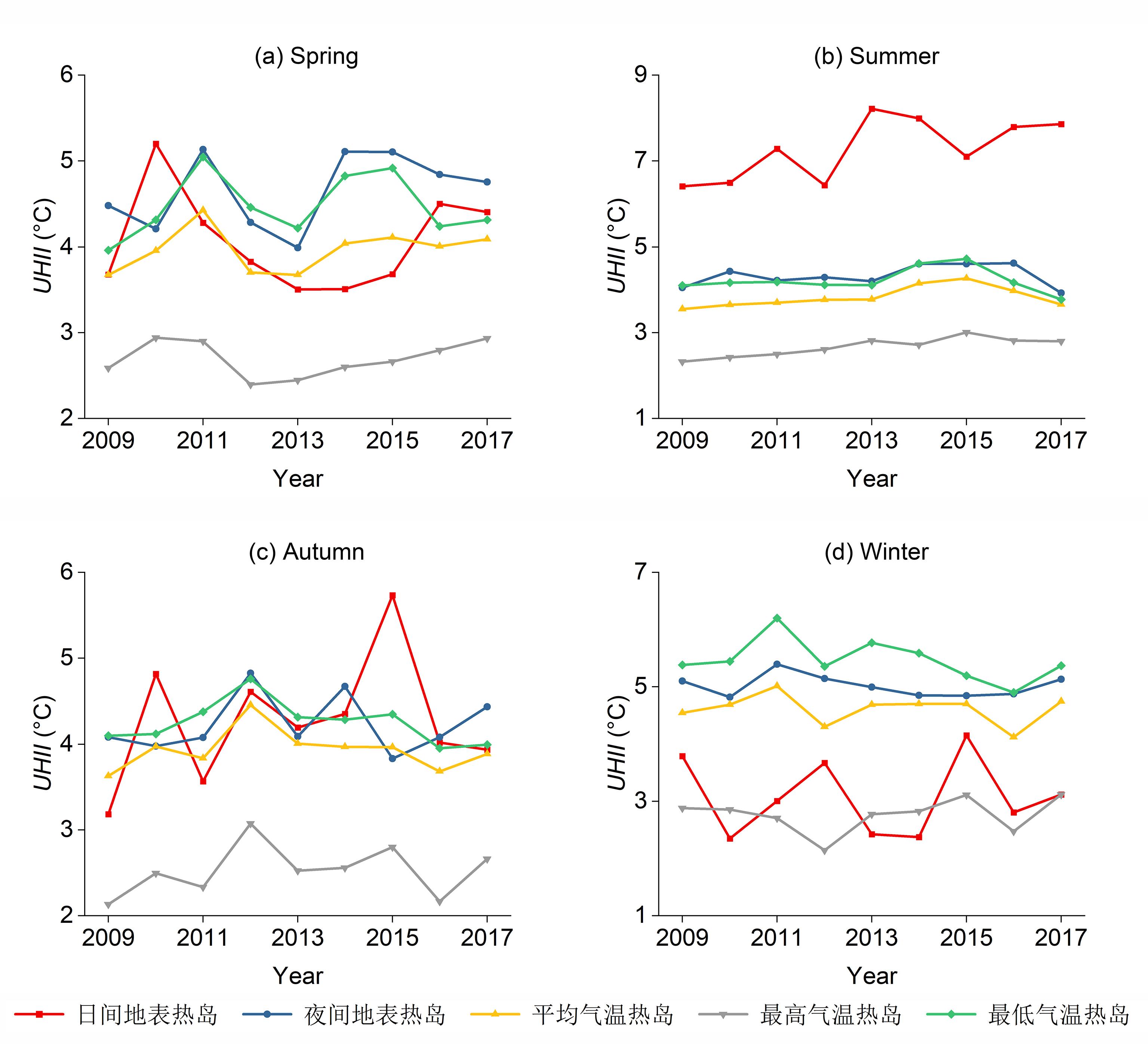 | 图4 北京地区2009-2017年地表热岛与冠层热岛四季均值比较 |