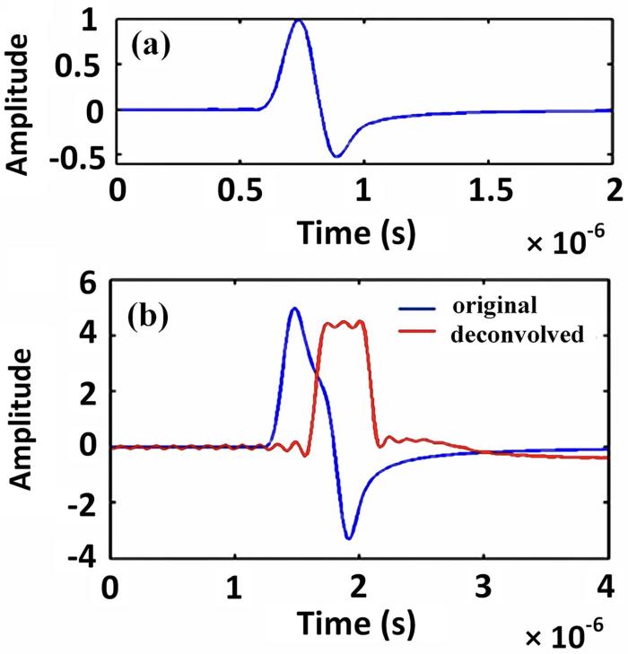 (a) The deconvolution kernel, (b) the contrast between the original signal and the signal after deconvolution