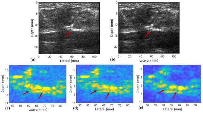 图6e是由RyLns方式进行采集的信号重建出的图像,这种方式的成像效果比Flash好,而且由于聚焦深度可调,所以RyLns发射接收方式对于深度大的成像目标具有更好的成像效果.考虑到该细节位置深度较大,所以采用RyLns方式采集的信号作为一个真值来验证反卷积处理前后的效果.从图6e中可以看出,两个箭头所指位置的成像目标都是有一定间隔的,是相互分开的.在知道这两个组织的结构和相对位置之后,再看图6c和图6d,原始信号重建出的图像中这两个组织之间的间隔不明显,有伪影混叠,但反卷积处理后的信号所重建出的图像中组织之间的间隔变得清晰,可以反映出更加真实的组织结构,所以反卷积后的信号重建出的图像质量更好.