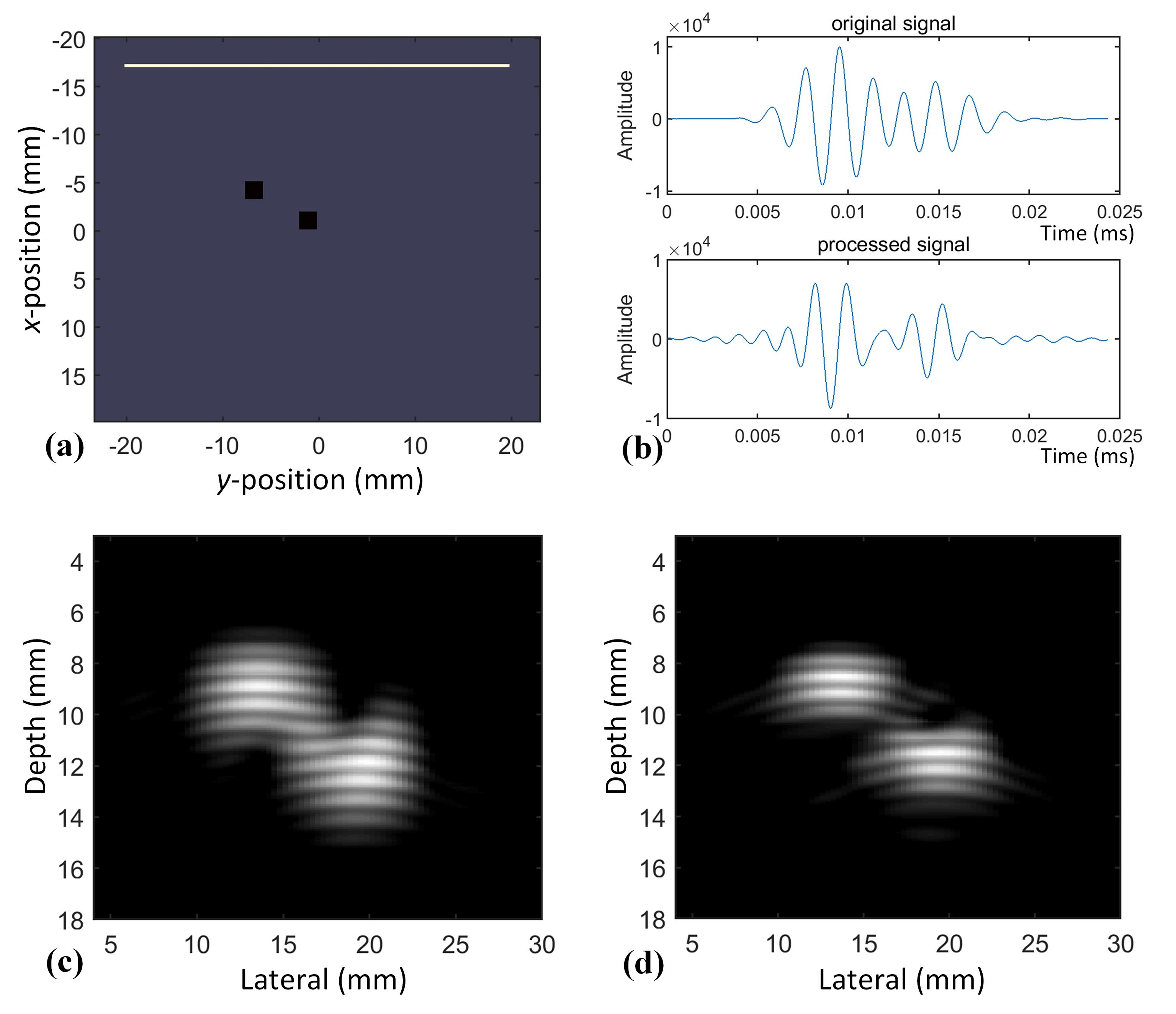 | Fig.2 The comparison of signal processing and image reconstruction in ultrasonic simulation:(a) the position setting of the imaging target and the sensor,(b) the signal processing process,(c) the image reconstructed from the original signal,(d) the image reconstructed from the deconvolution signal |