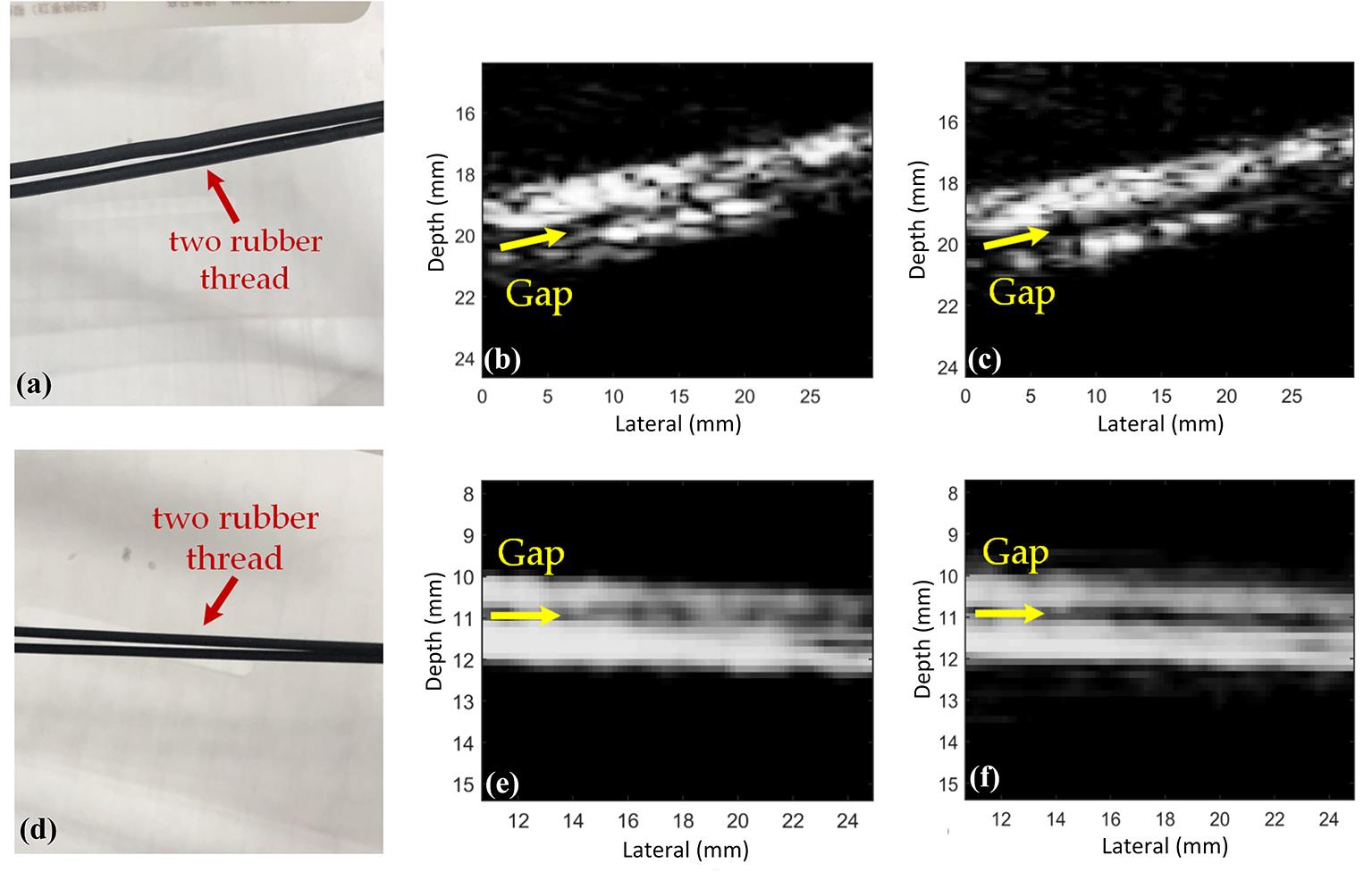 | Fig.5 (a) Real image of imaging target with L7?4 probe,(b) reconstructed image of original signals with L7?4 probe,(c) reconstructed image of deconvolution signals with L7?4 probe,(d) real image of imaging target with CL15?7 probe,(e) reconstructed image of original signals with CL15?7 probe,(f) reconstructed image of deconvolution signals with CL15?7 probe (d) CL15?7探头成像目标实拍图;(e) CL15?7探头原始信号重建的图像;(f) CL15?7探头反卷积后的信号重建的图像 |