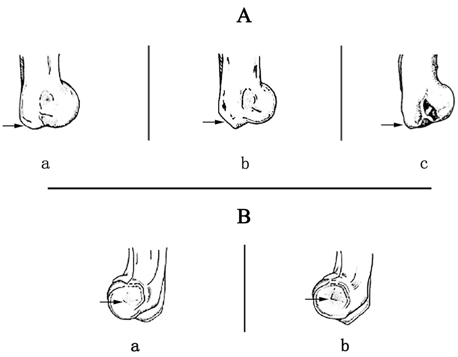 | 图4 山羊、绵羊和羚羊在肱骨远端上的形态特征 A——远端内侧:(a)绵羊/盘羊属(Ovis sp.);(b)山羊(Capra hircus)(源自文献[ |