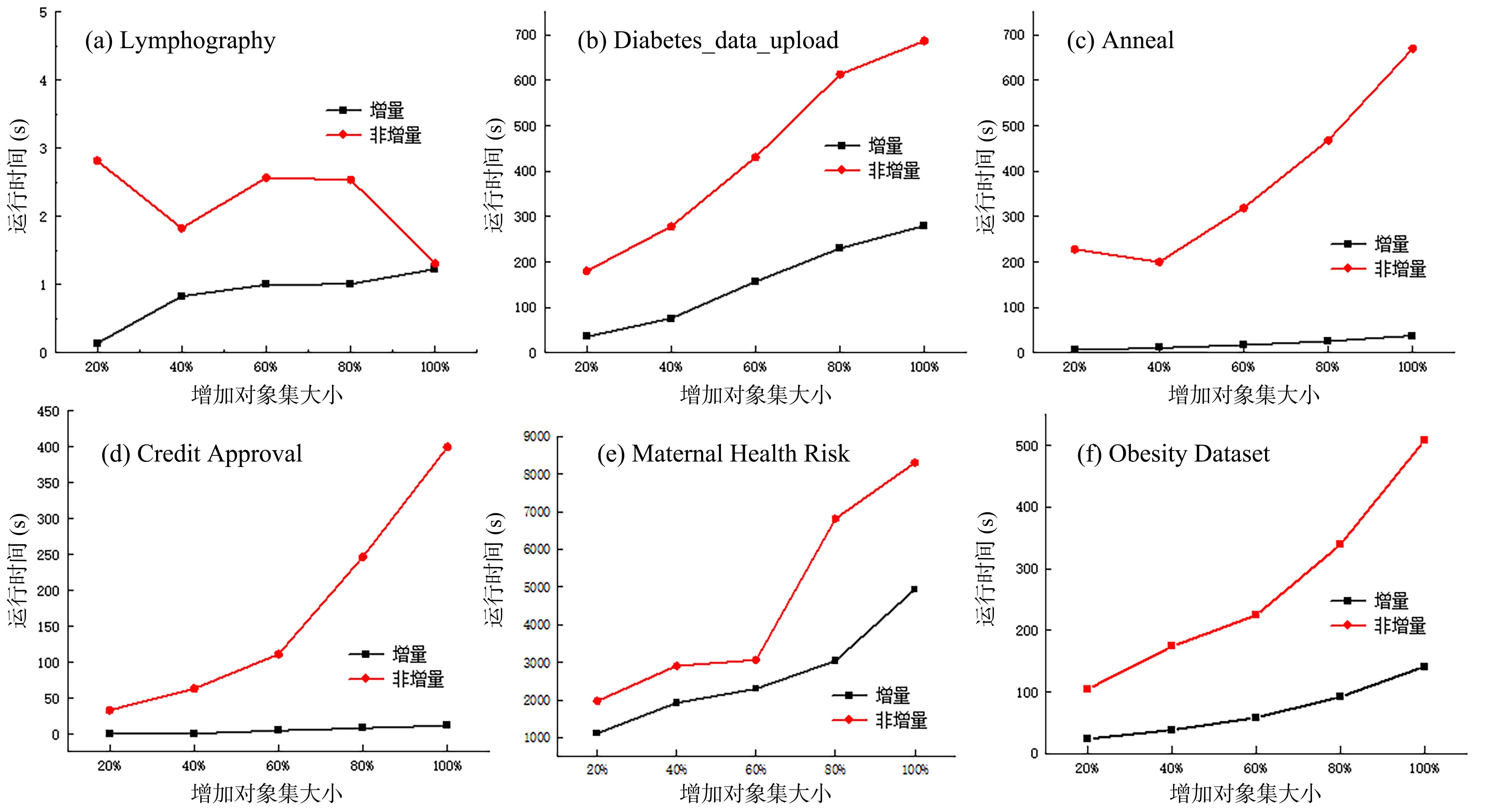 | 图3 两种算法在六个数据集上增加一组对象时消耗的时间对比 |