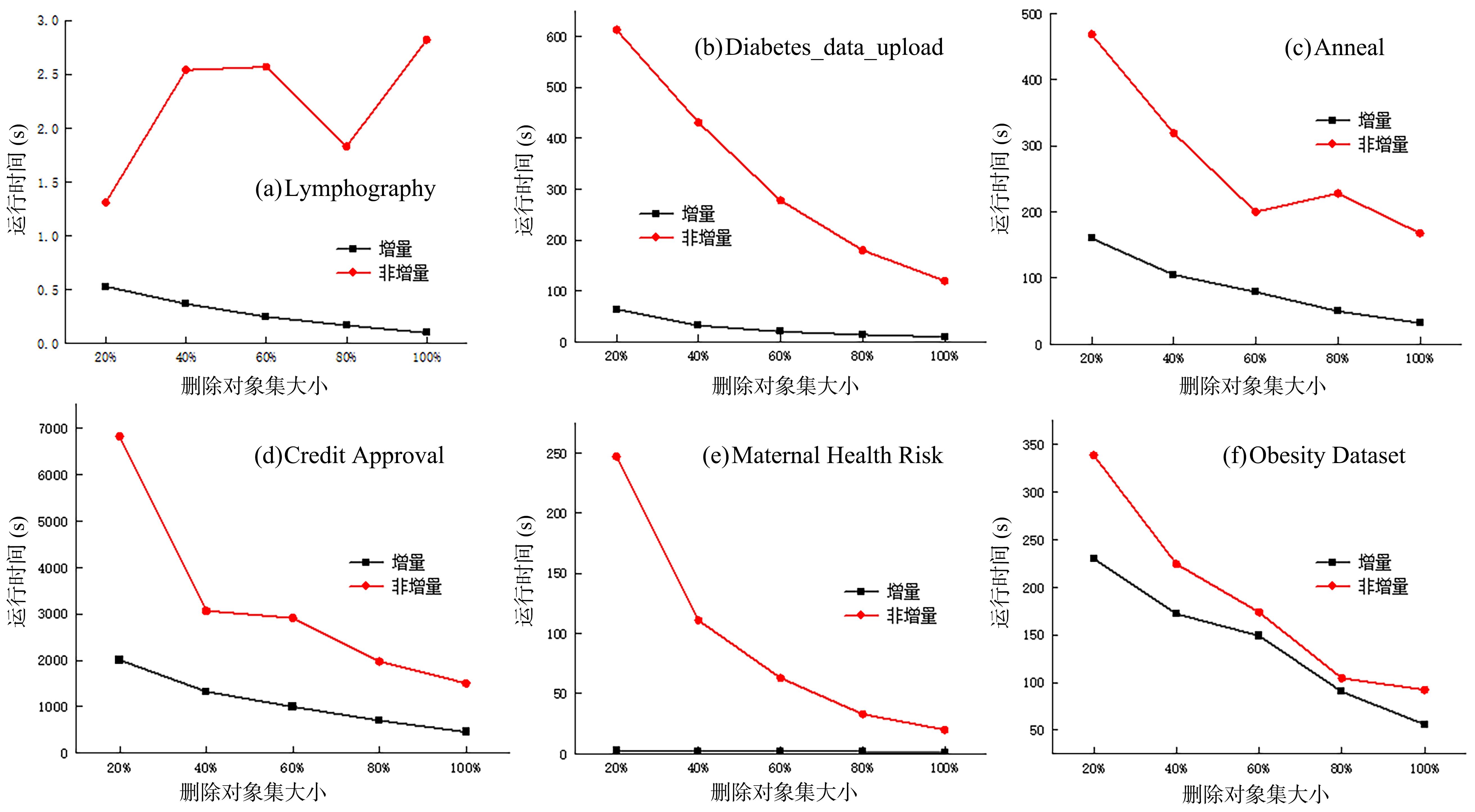 | 图4 两种算法在六个数据集上删除一组对象时消耗的时间对比 |